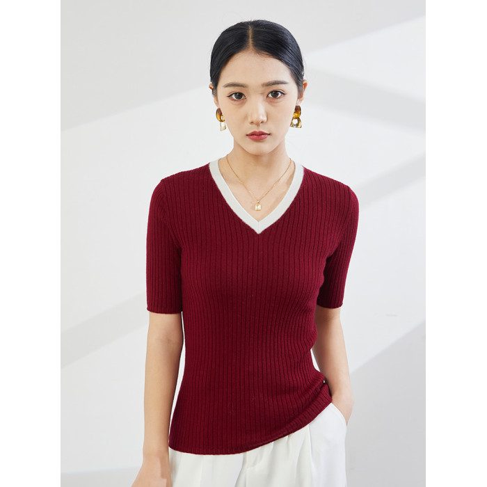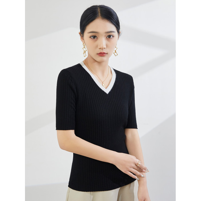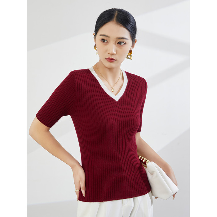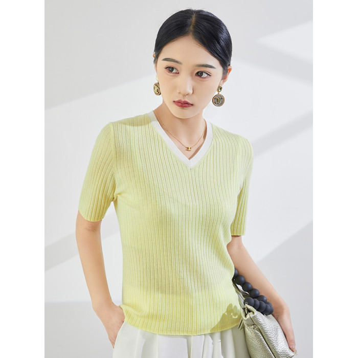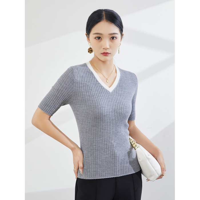 2025春夏新款精紡羊毛V領針織衫短袖拼色坑條顯瘦套頭打底衫上衣