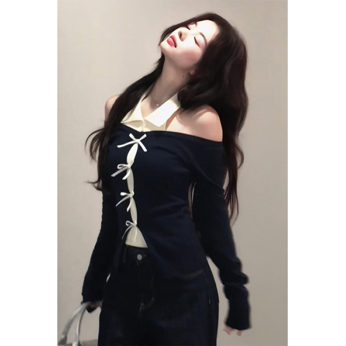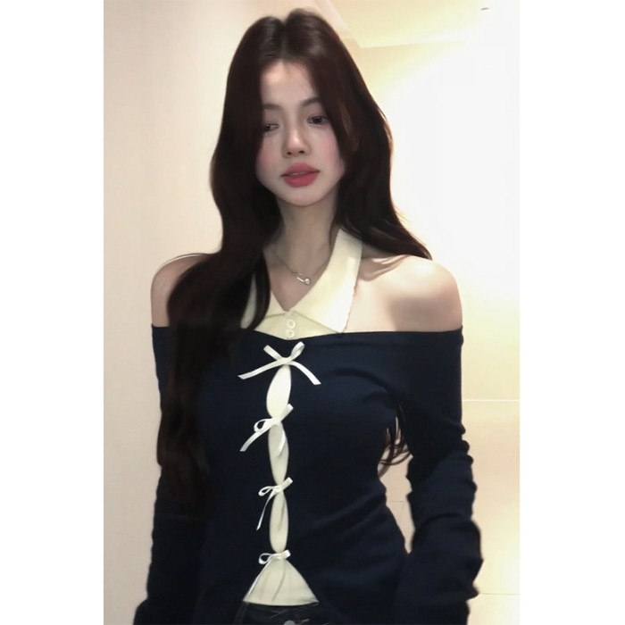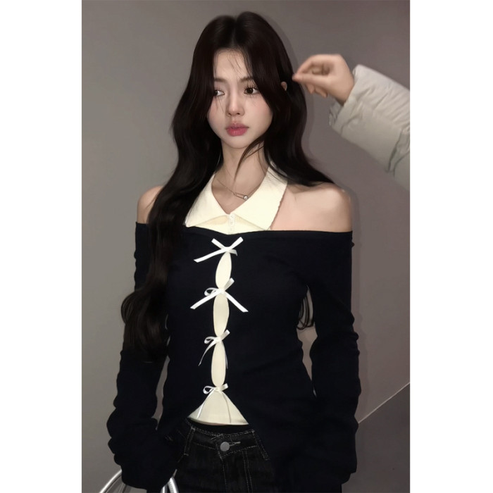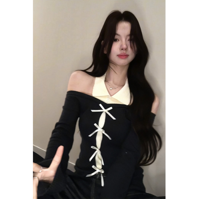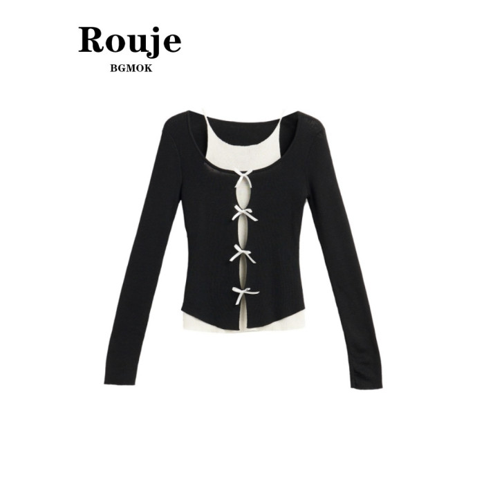 ROUJE BGMOK假兩件長袖針織衫女2025春秋季打底衫修身設計感上衣