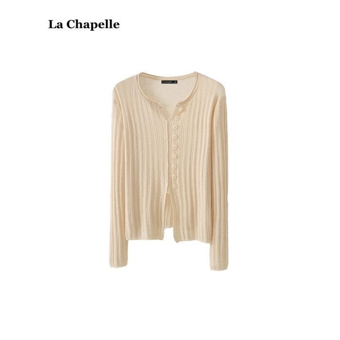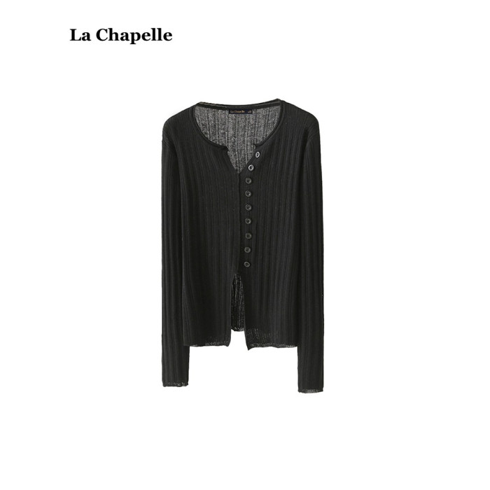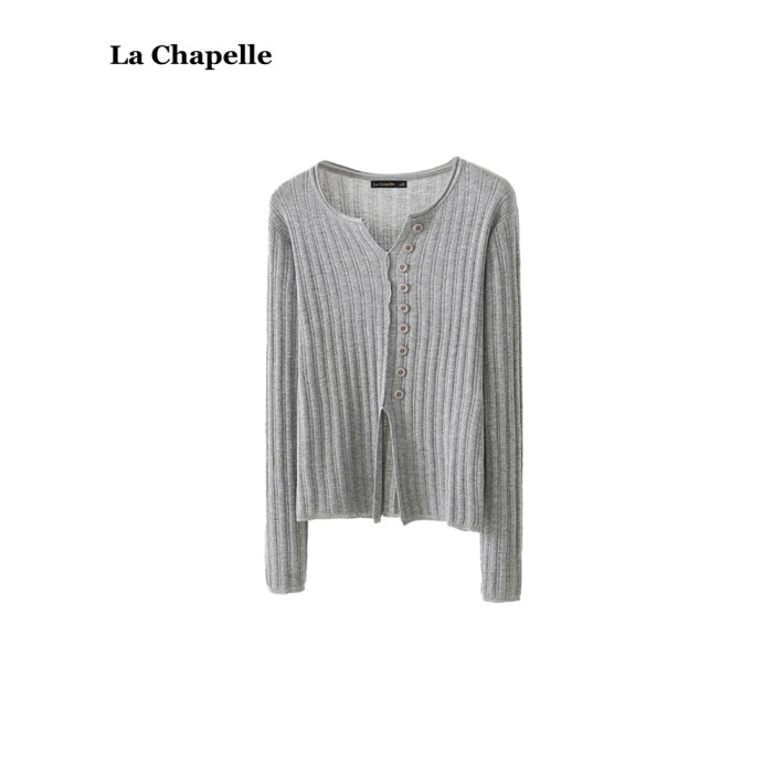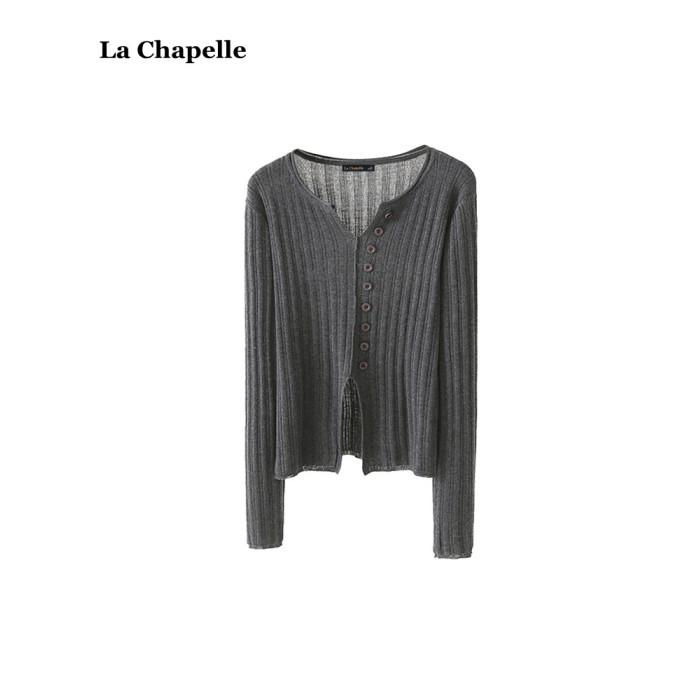 拉夏貝爾/La Chapelle秋季新款設計感V領針織衫女開叉紐釦打底衫