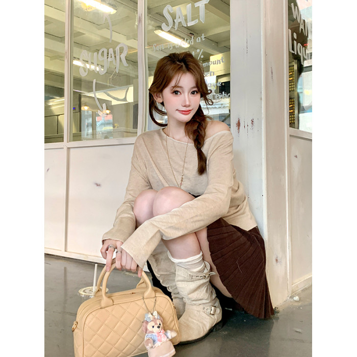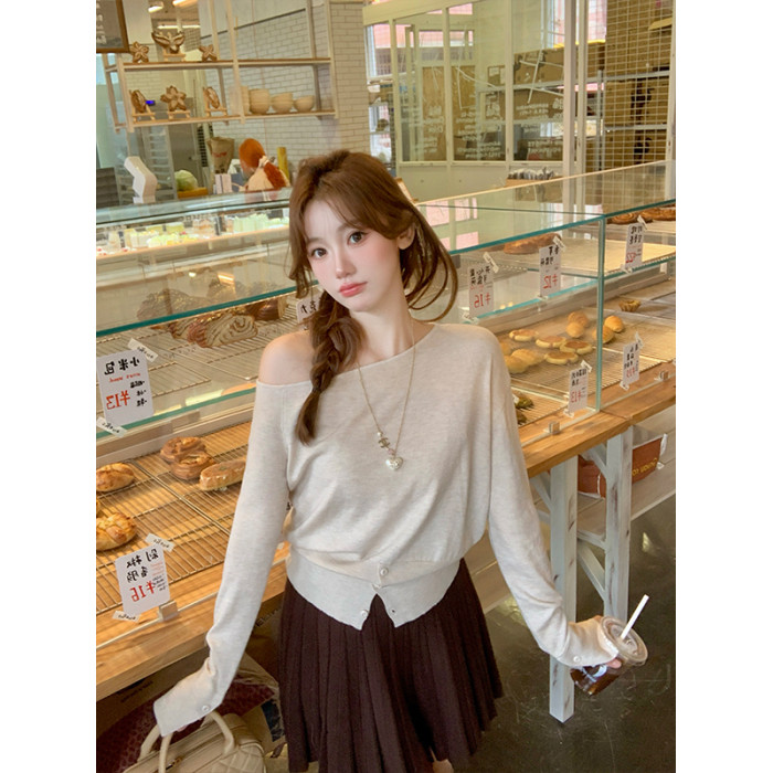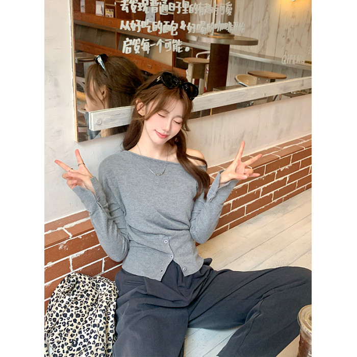薄款防曬罩衫絕美露肩斜肩一字領針織長袖打底衫秋開叉甜辣上衣