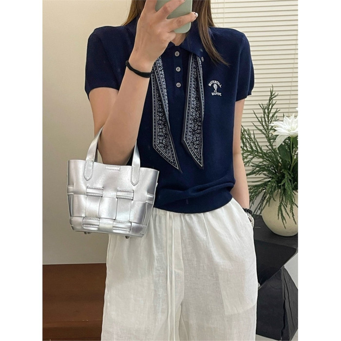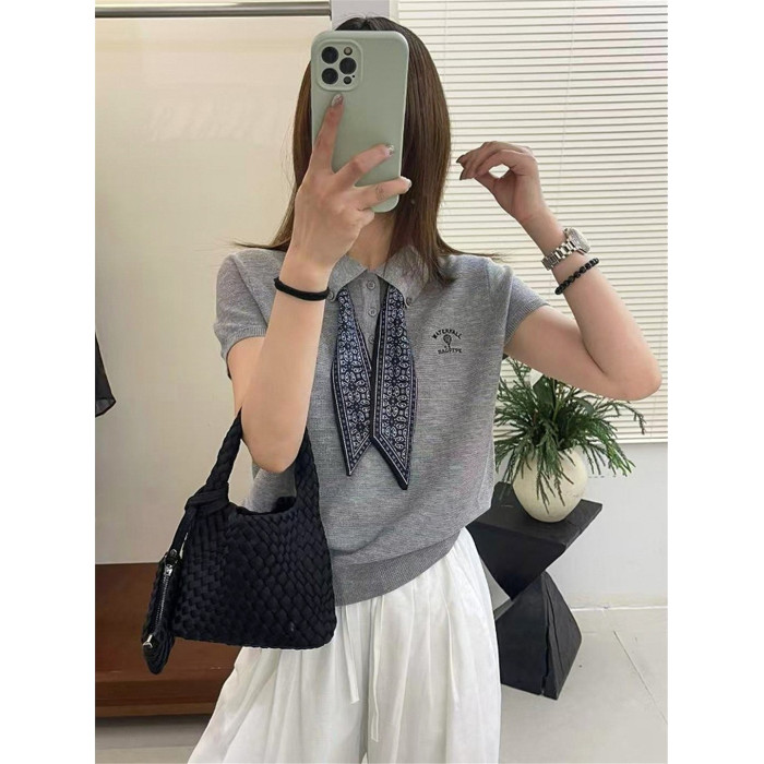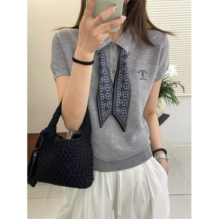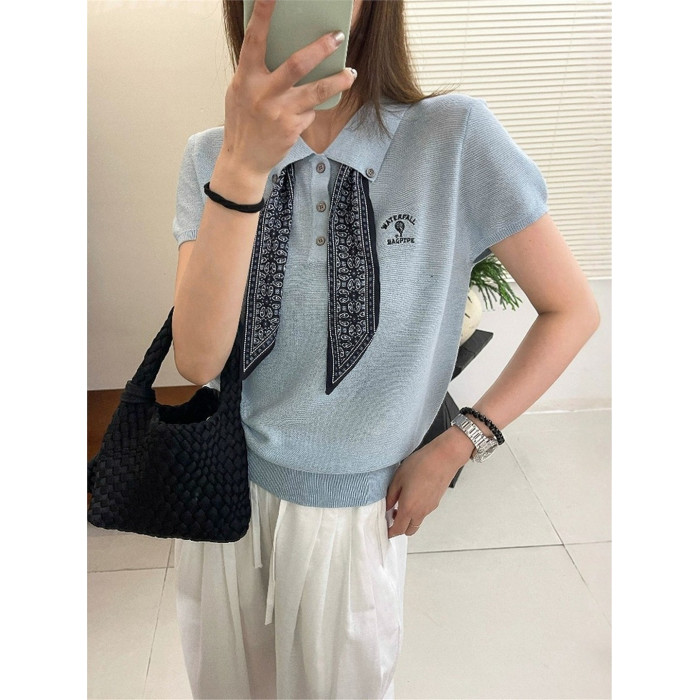 品牌撤櫃剪標配絲巾翻領冰絲針織衫女裝歐洲站夏裝歐貨洋氣打底衫
