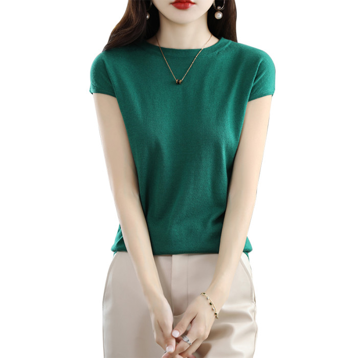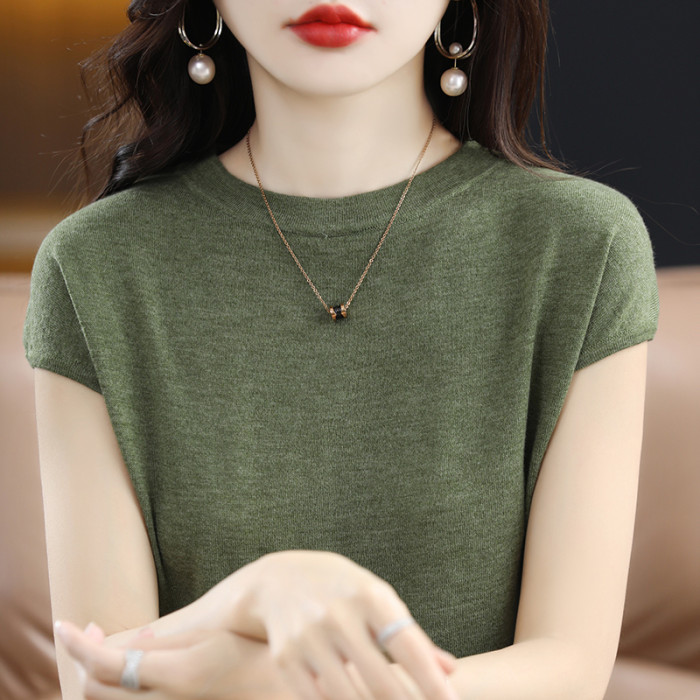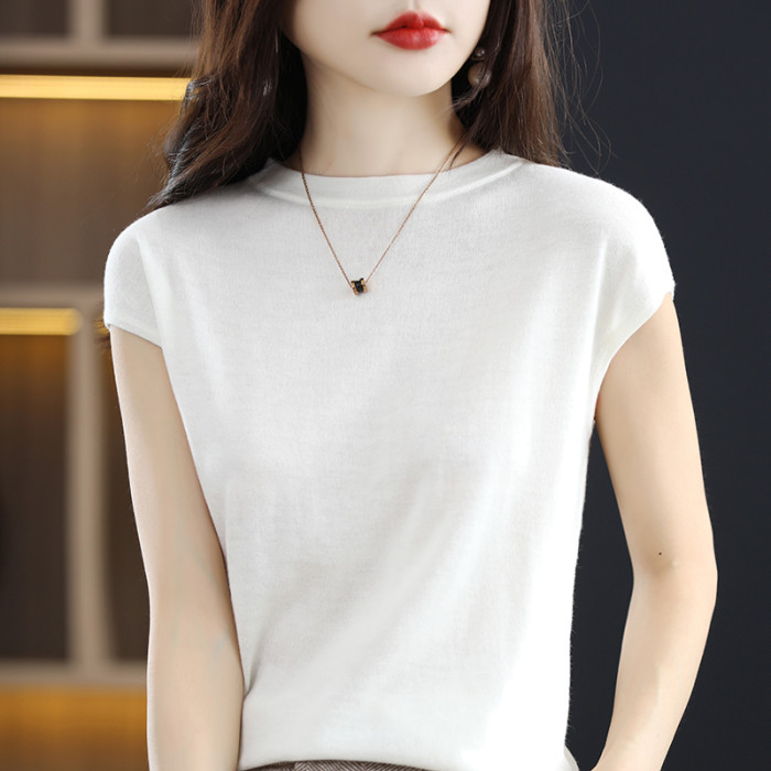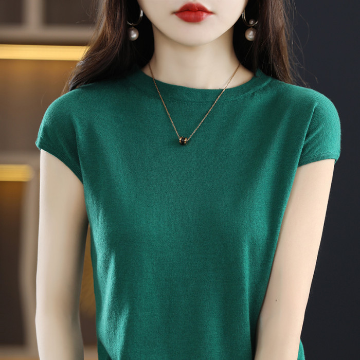 夏季新款精紡細支羊毛針織女圓領無袖背心寬松短款短袖薄款打底衫