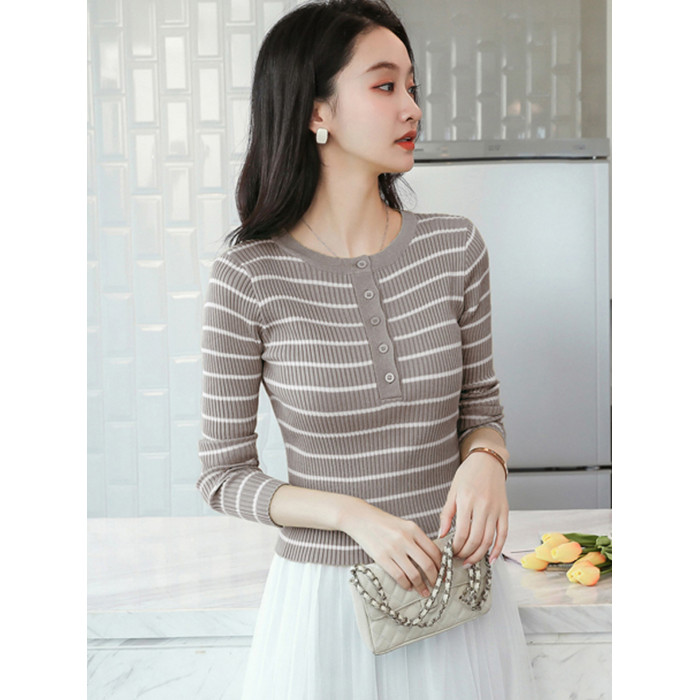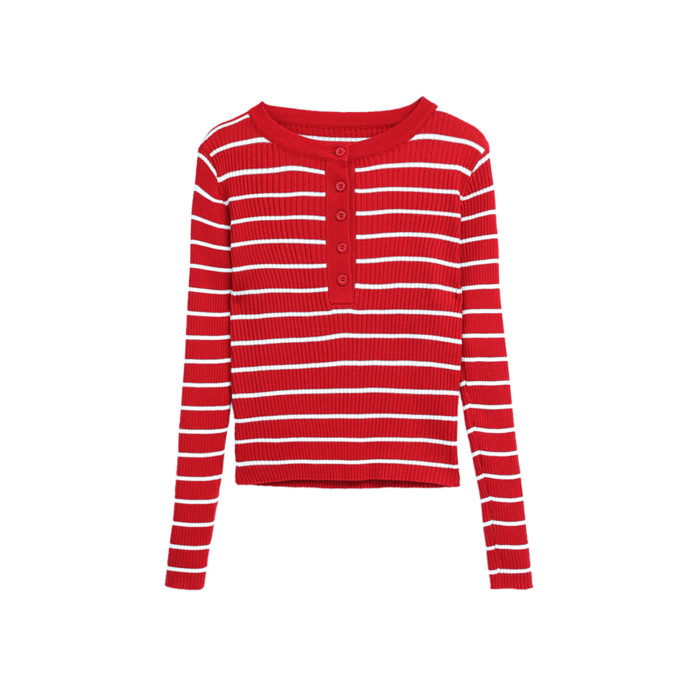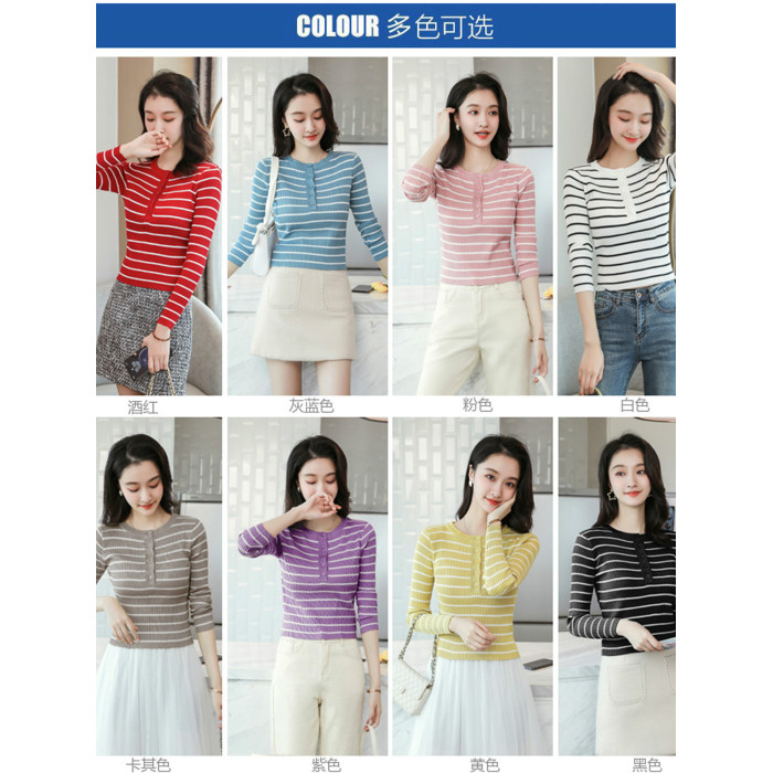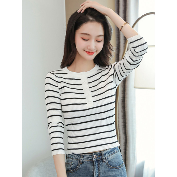 條紋針織衫女長袖秋季新款女裝修身毛衣打底衫小個子洋氣短款上衣