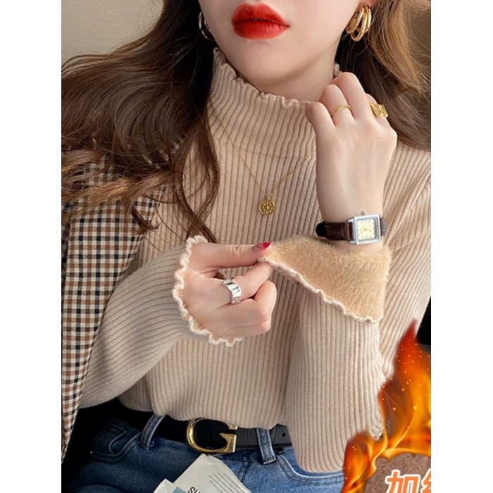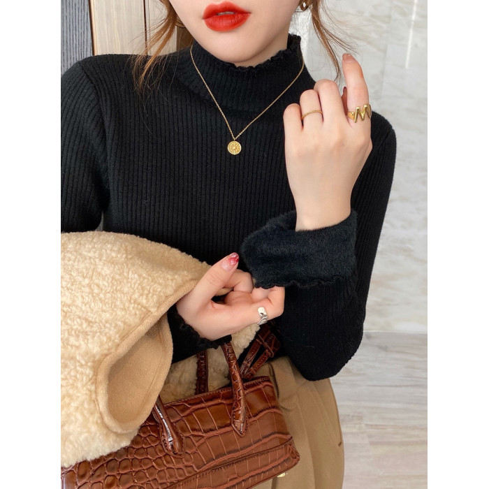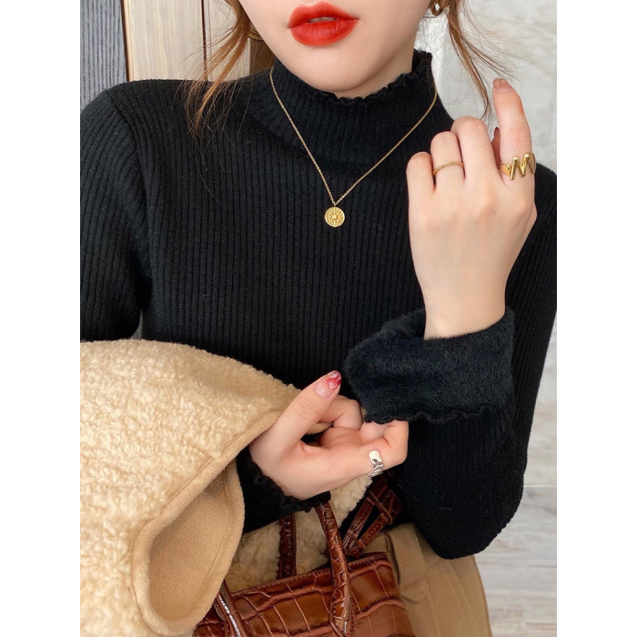 一體絨半高領毛衣女秋冬季加絨加厚高中初中學生內搭衣針織打底衫