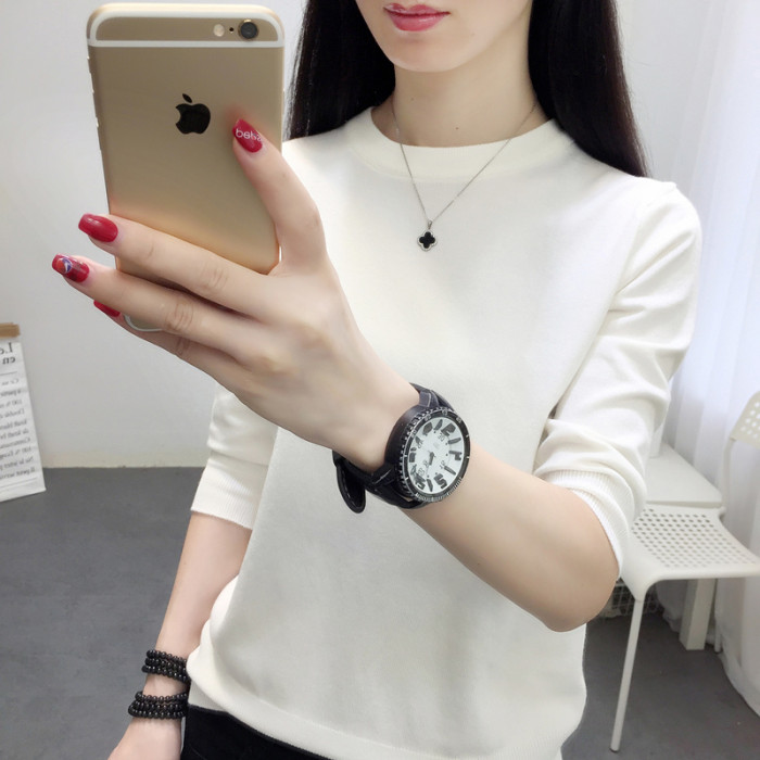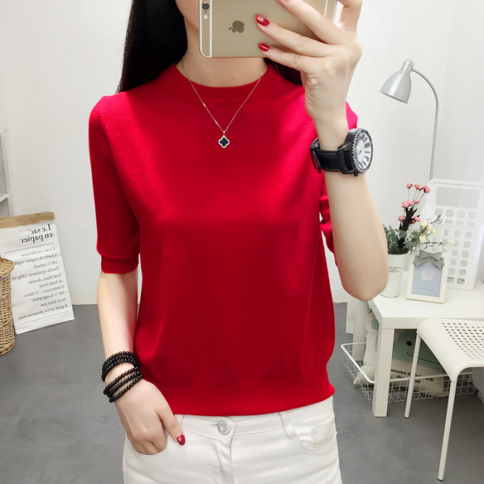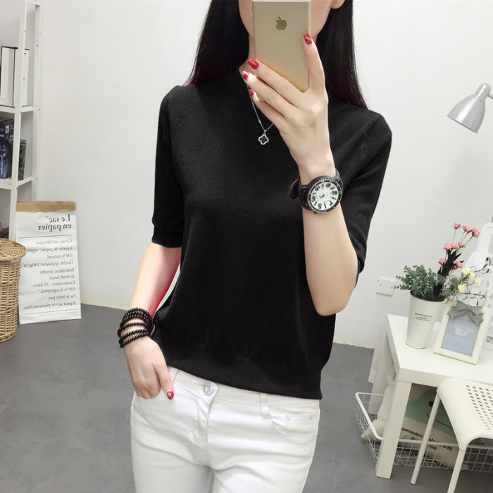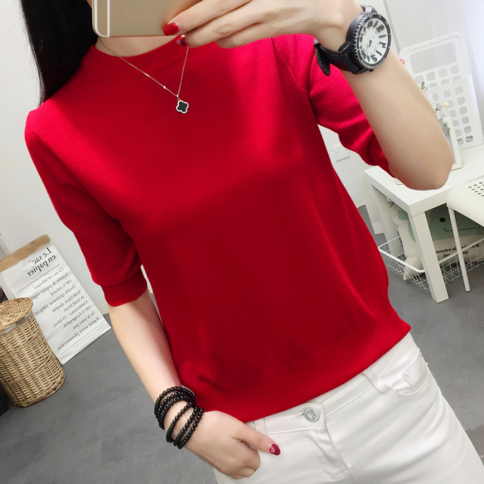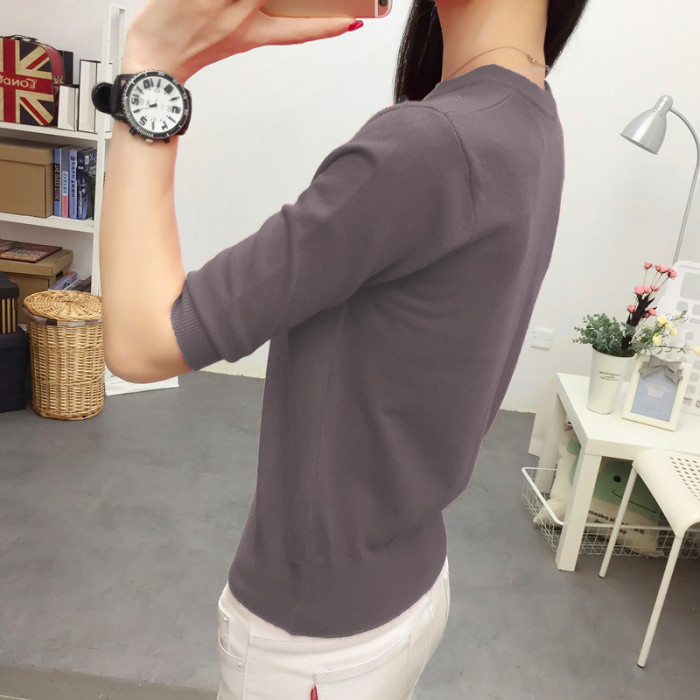 2025春季新款女士歐美風中袖五分圓領針織寬松簡時尚氣質打底衫薄