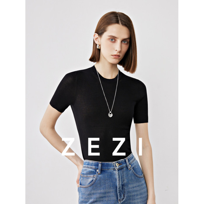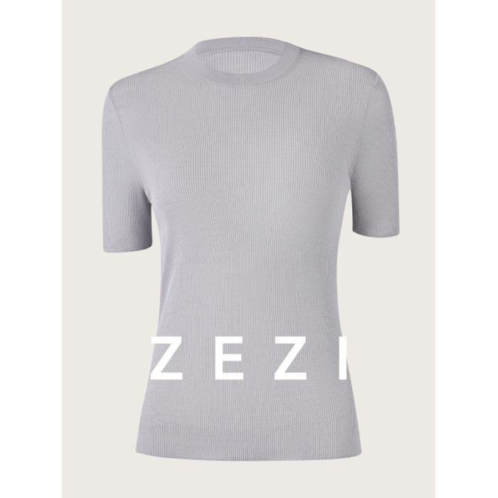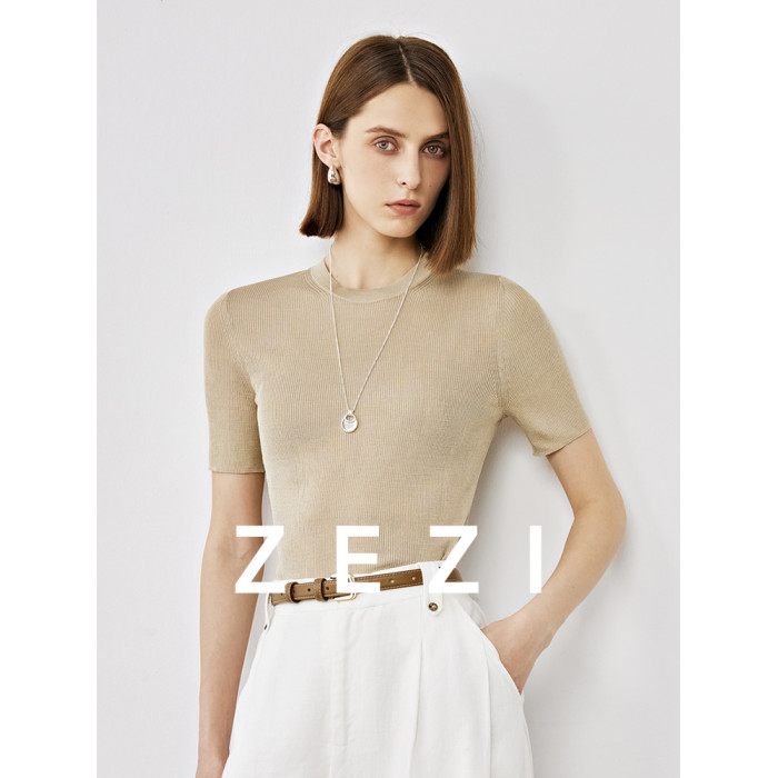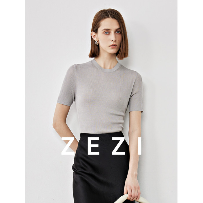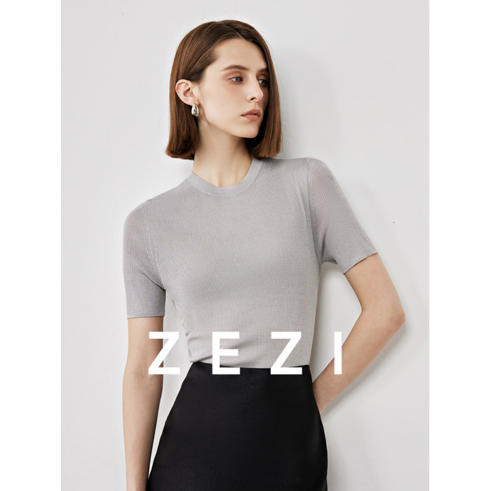 zezi桑蠶絲針織短袖女新款超細紗線針織打底衫通勤純色圓領內搭