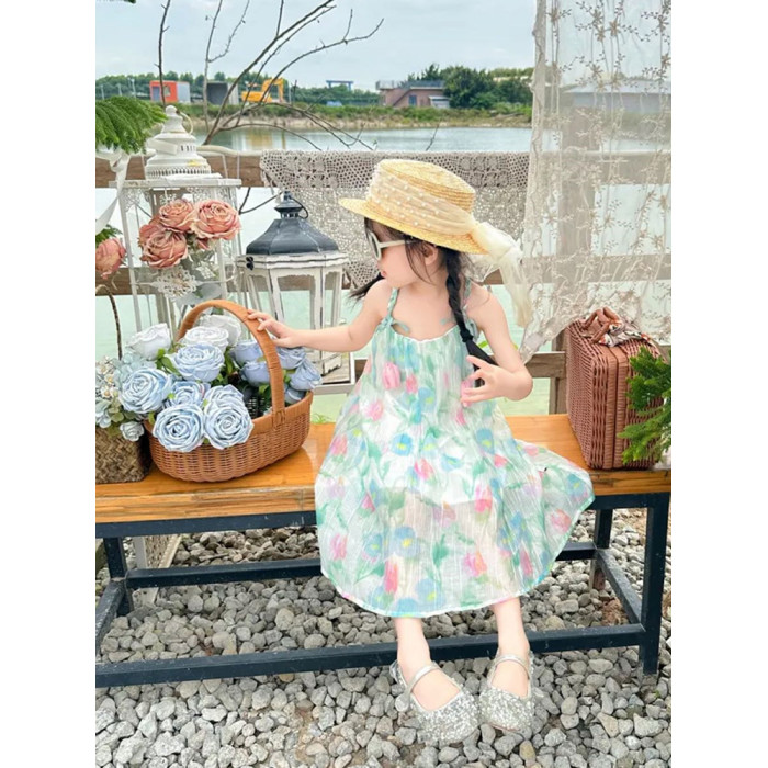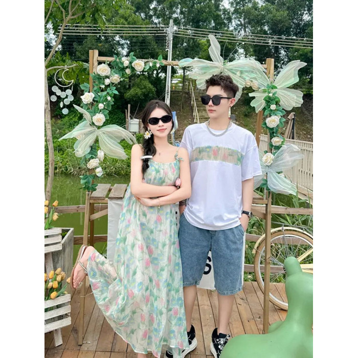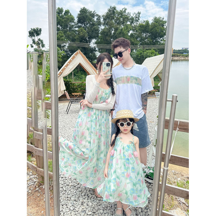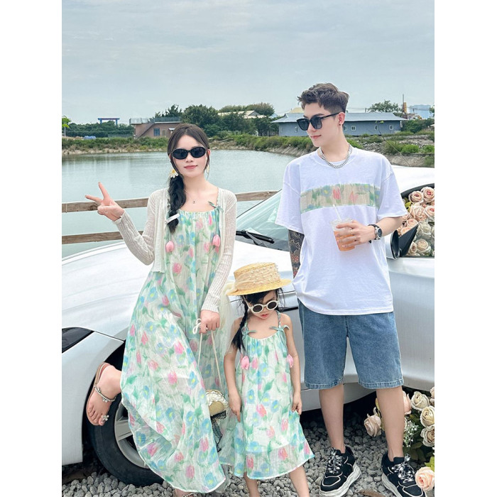 度假親子裝碎花吊帶連衣裙一家三口四口花朵母子母女裝短袖t恤夏