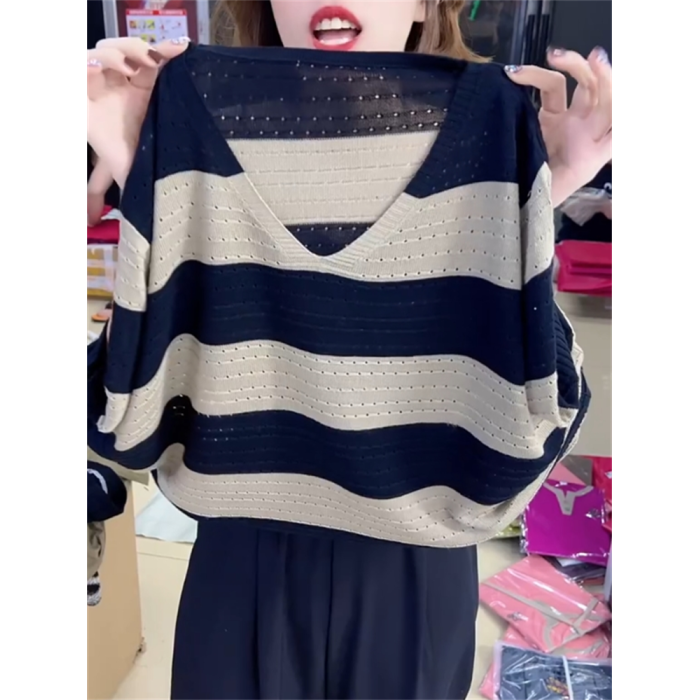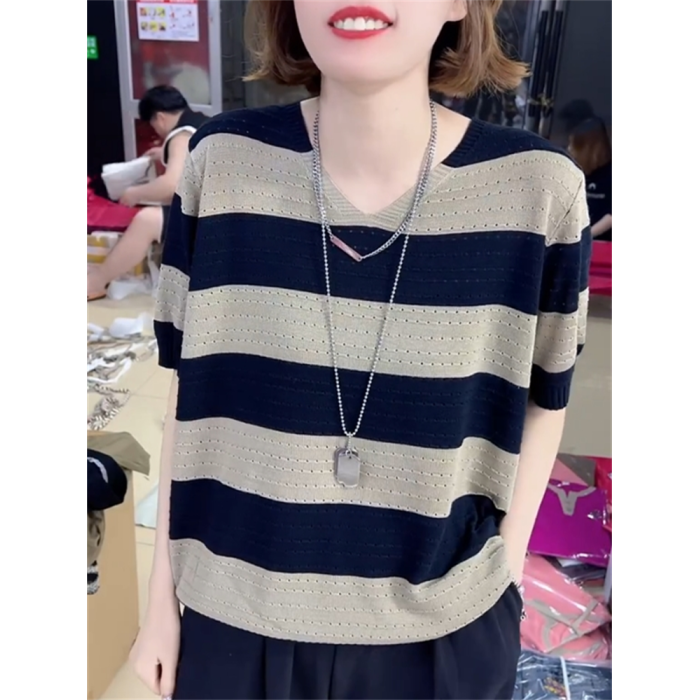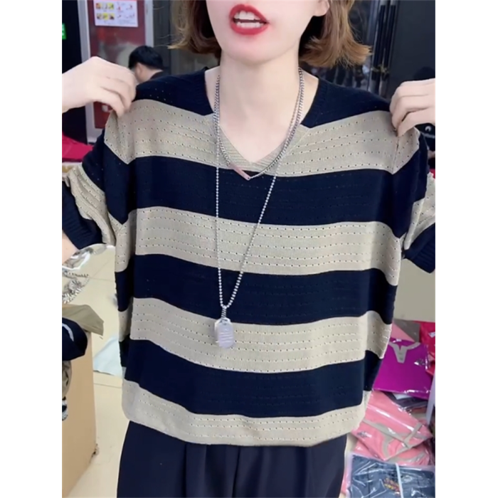2024年寬松休閒風V領設計針織衫鏤空透氣夏季條紋短袖打底衫女裝