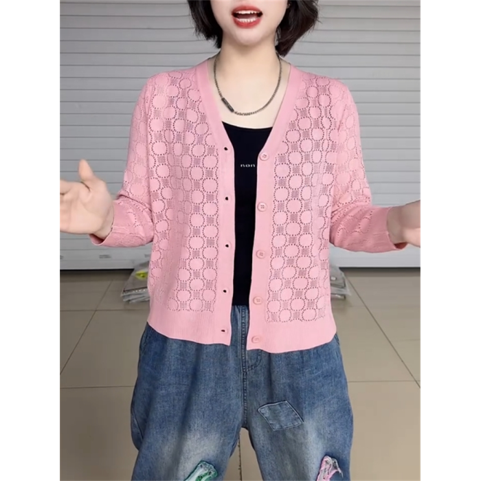 V領鏤空薄款夏季親膚透氣針織開衫小個子百搭粉色甜美防曬打底衫