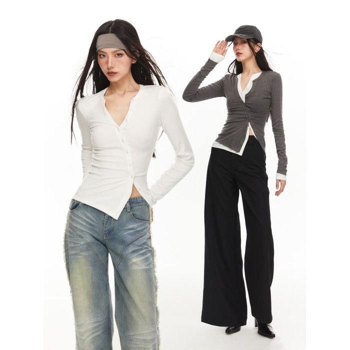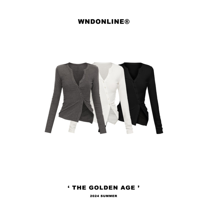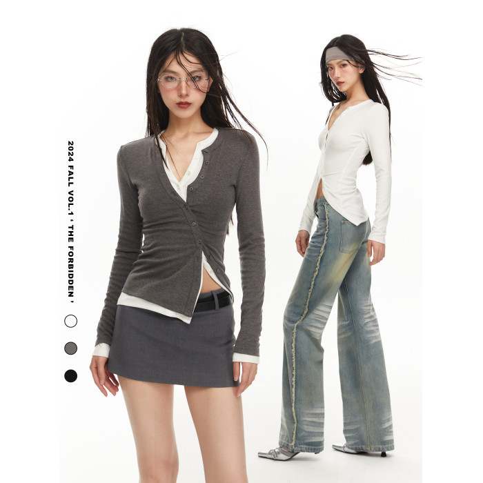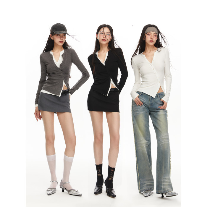 WHYNOTDANCE 焦點 亨利領解搆斜門襟三色曡穿針織打底衫