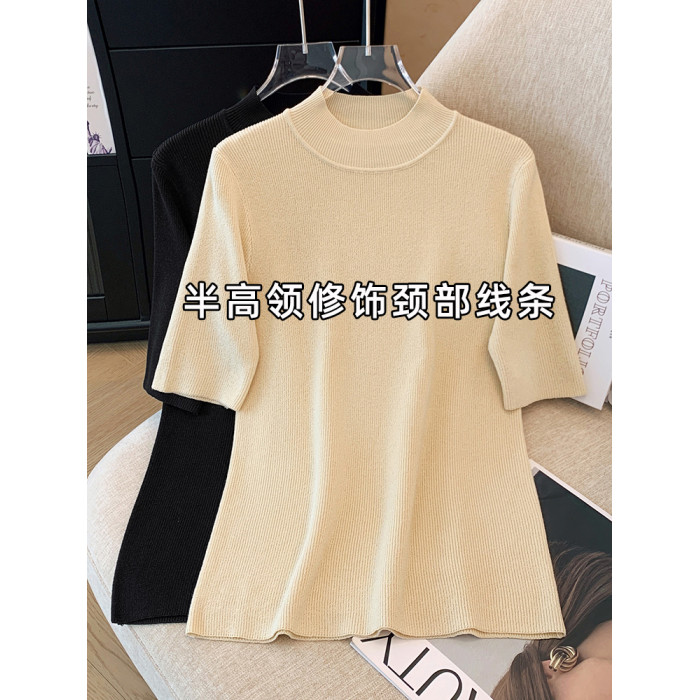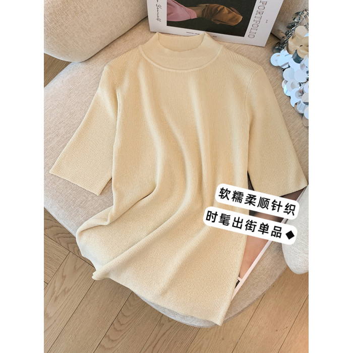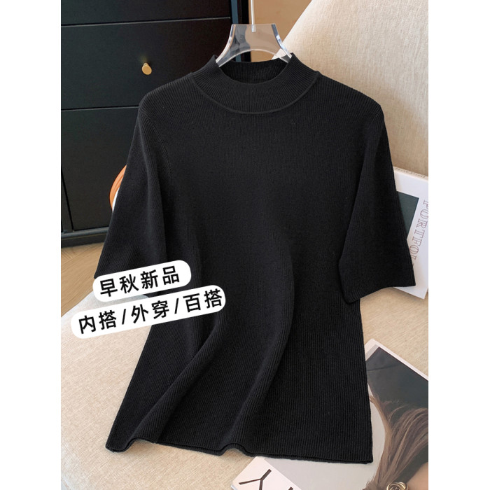 胖mm顯瘦正肩半高領中袖針織衫女大碼春秋五分袖內搭打底衫上衣