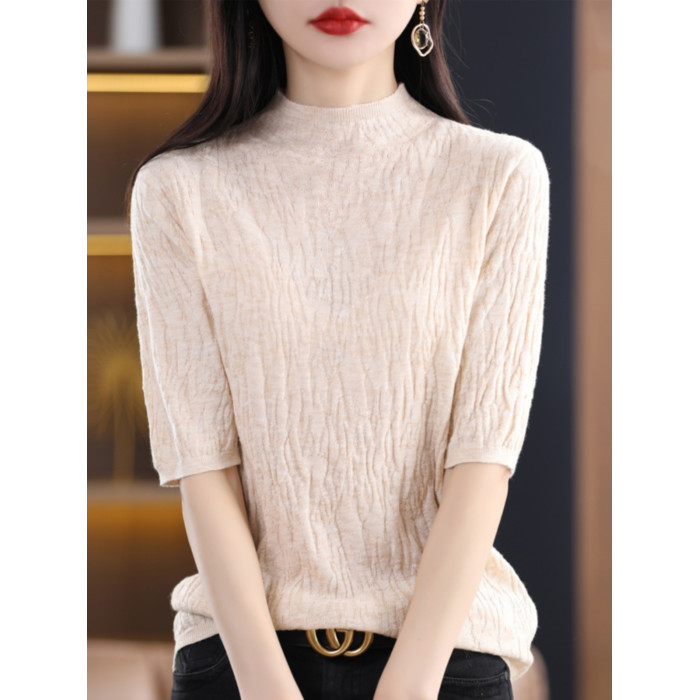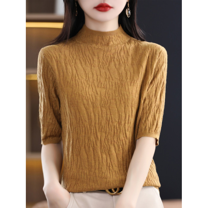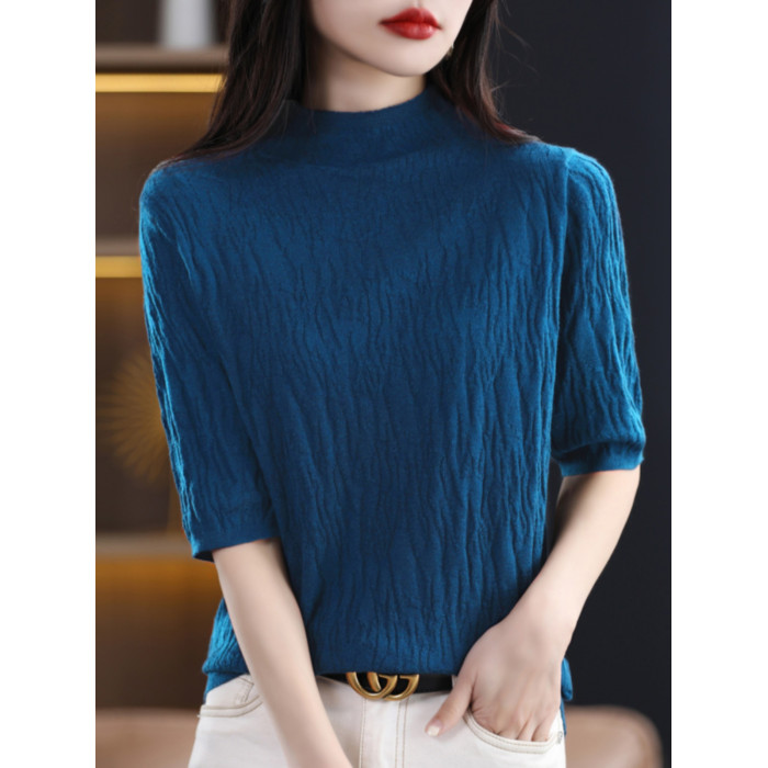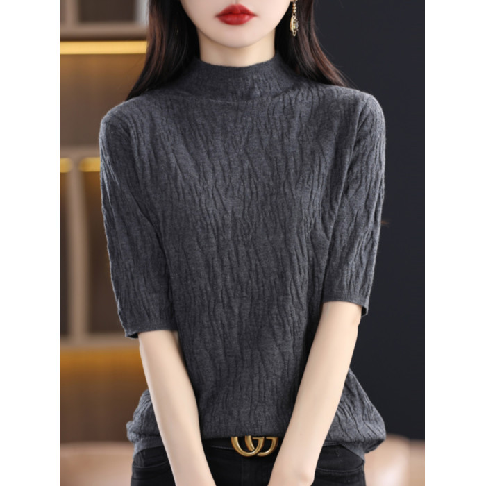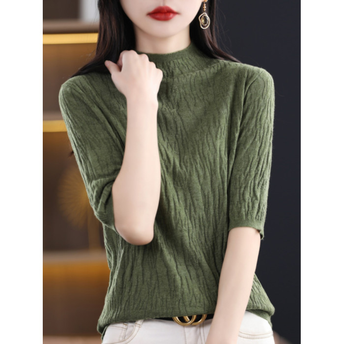 法式半高領五分袖針織打底衫女薄款秋冬時尚純色毛衣中袖大碼上衣
