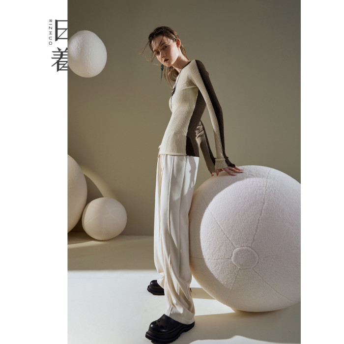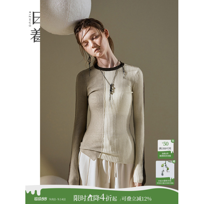 日著原創設計感拼色嵌花坑條打底衫2025秋季新款圓領彈力修身上衣