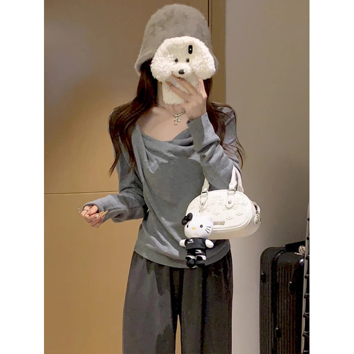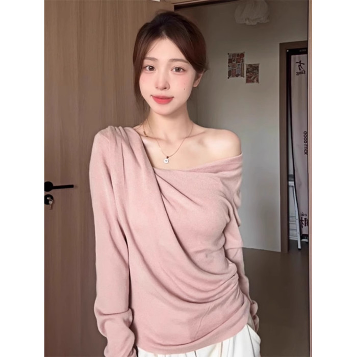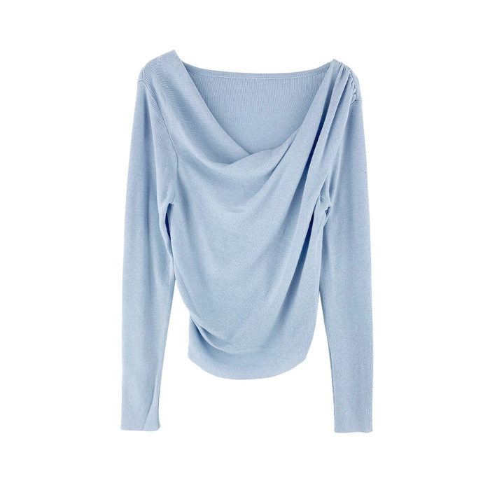 韓國淺藍色不規則蕩領扭結針織上衣女2025春夏修身露肩打底衫長袖