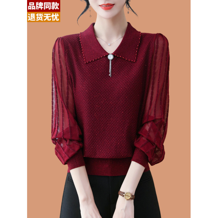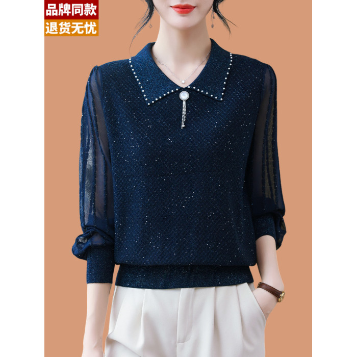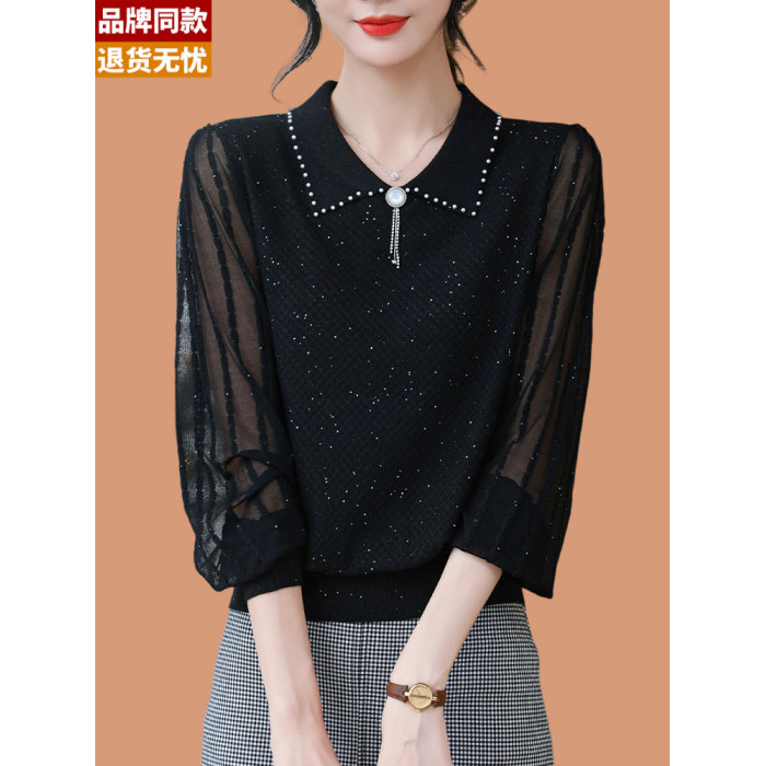 翻領冰絲針織衫長袖上衣女秋裝2025新款洋氣媽媽寬松薄紗袖打底衫