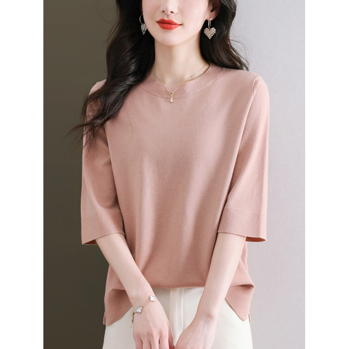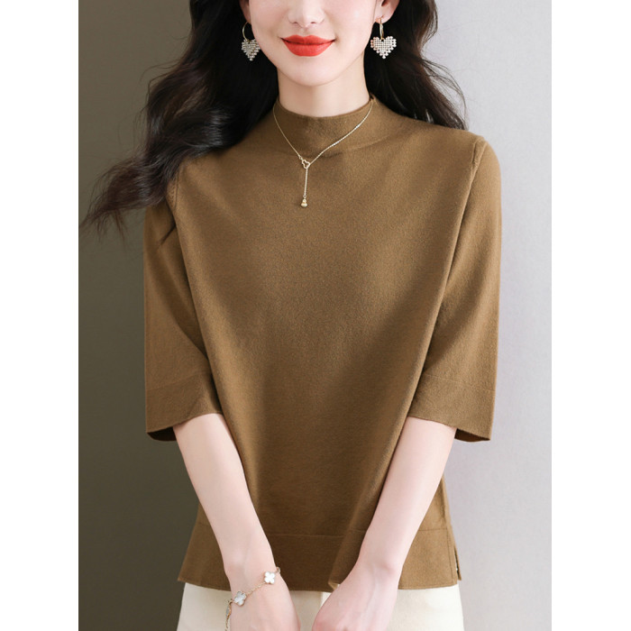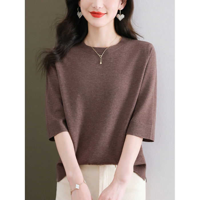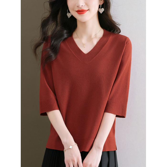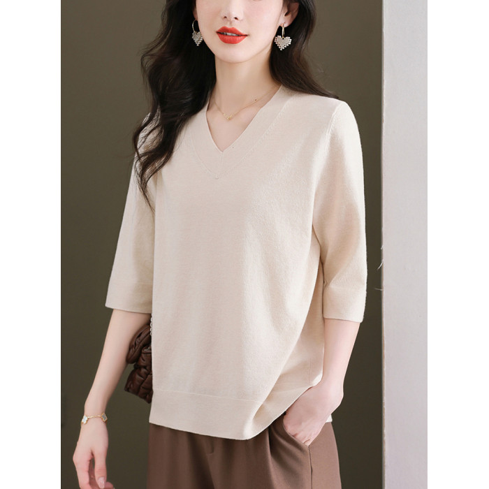 中年媽媽純色中袖羊毛針織上衣寬松大碼顯瘦羊毛衫薄款洋氣打底衫