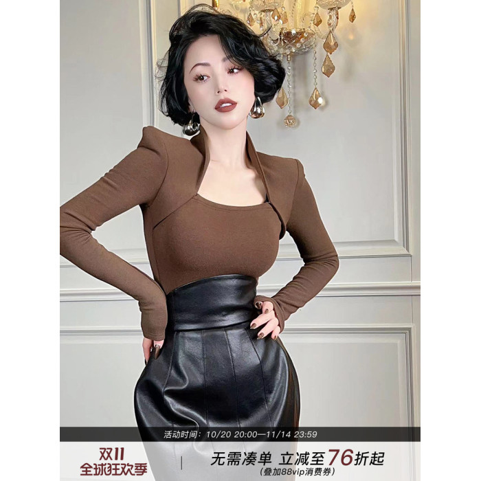 LYXJ【南法藝術】設計感立領墊肩內搭女春秋季復古修身針織打底衫