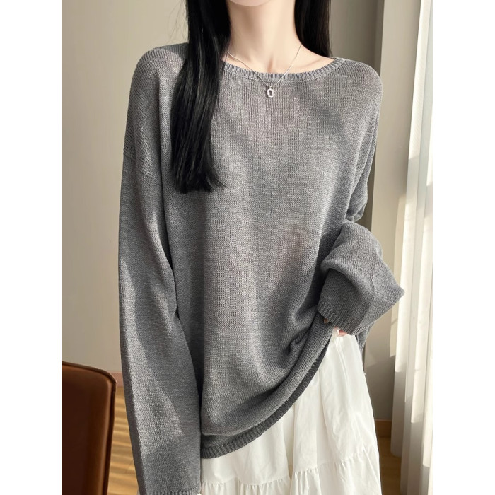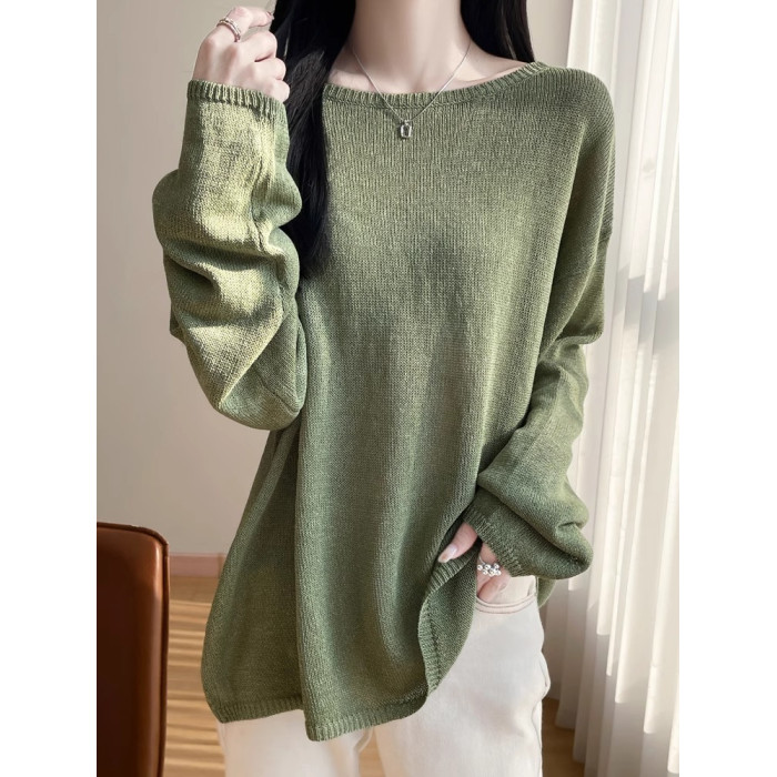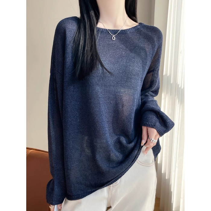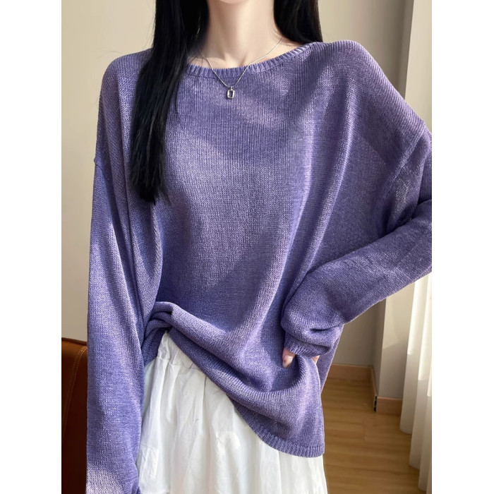 一字領微透亞麻針織打底衫寬松慵懶風和紙紗高級感長袖罩衫防曬衫