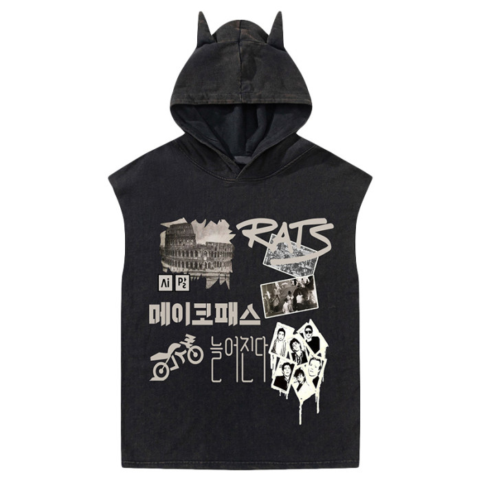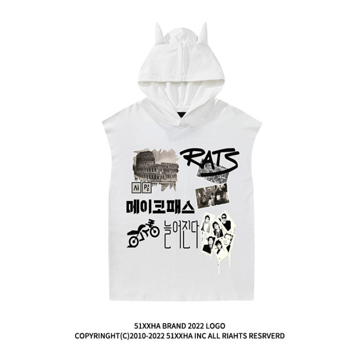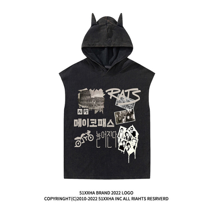 vintage復古年代懷舊印花連帽背心男款夏季hiphop運動健身無袖T恤