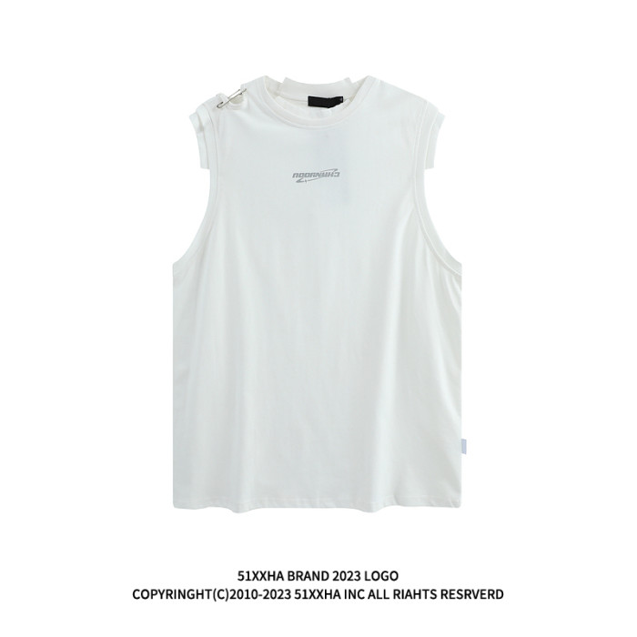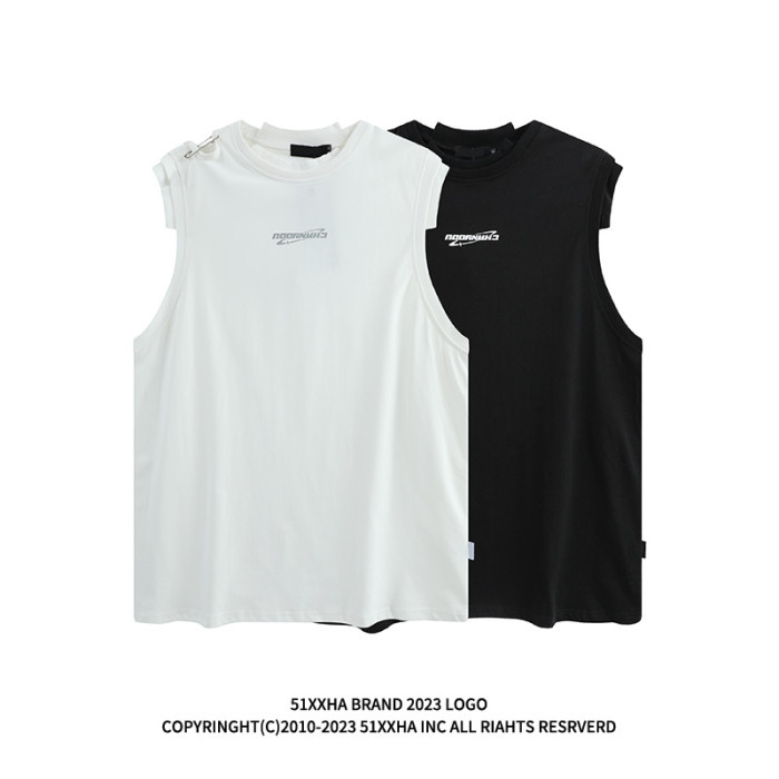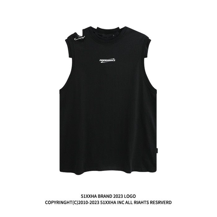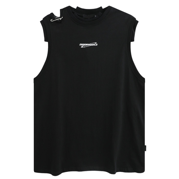 51嘻哈歐美創意別針裝飾黑色運動無袖T恤男潮牌寬松健身背心外穿