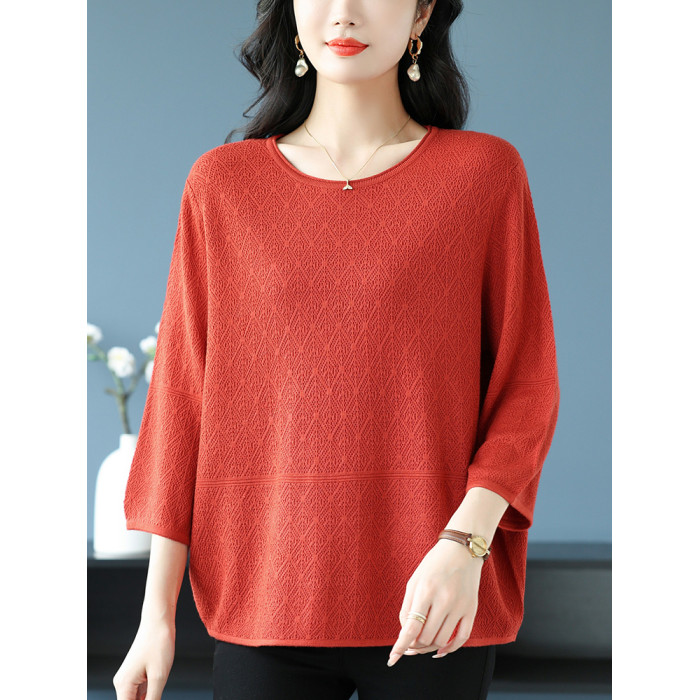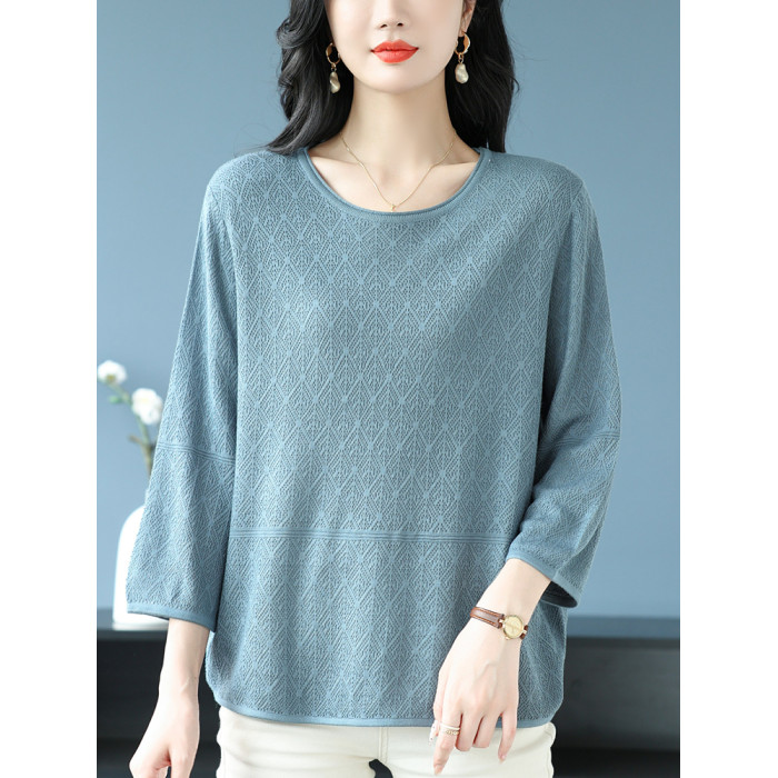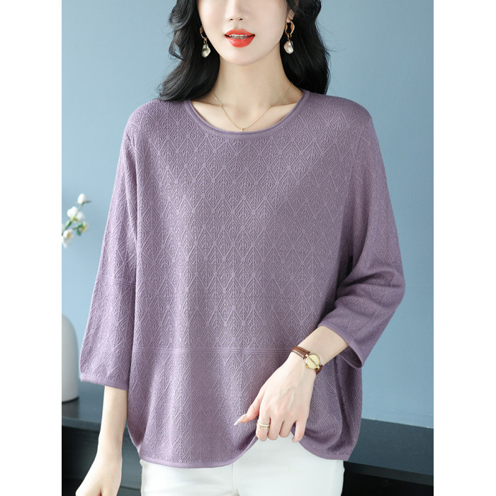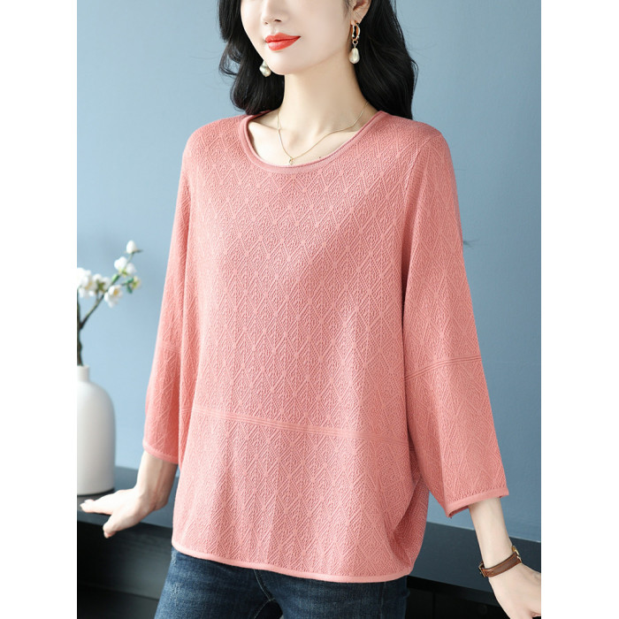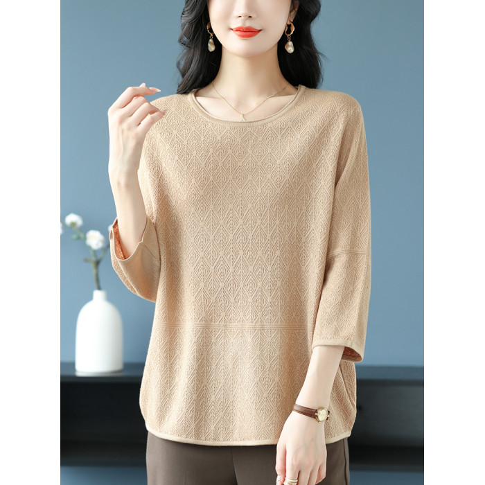 中年媽媽裝春夏上衣女桑蠶絲七分袖寬松特大碼冰絲針織圓領打底衫