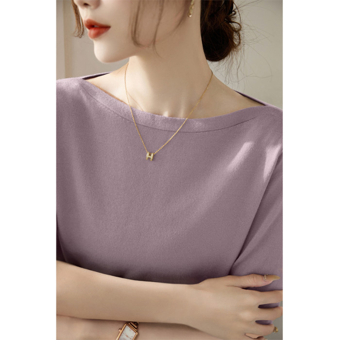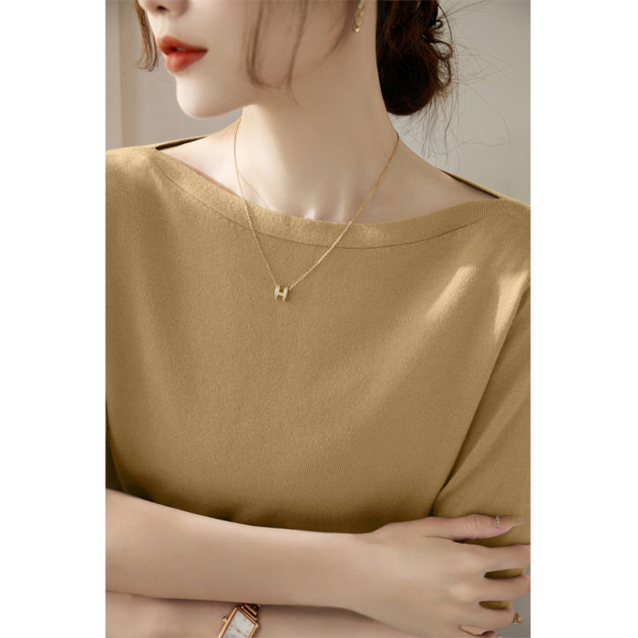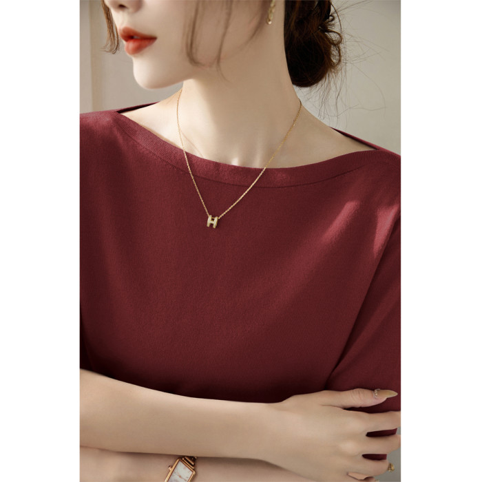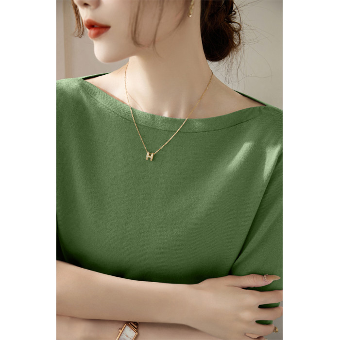 法式一字肩上衣高級感冰絲針織衫T恤女夏季2025新款綠色中袖上衣