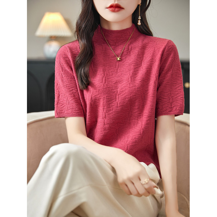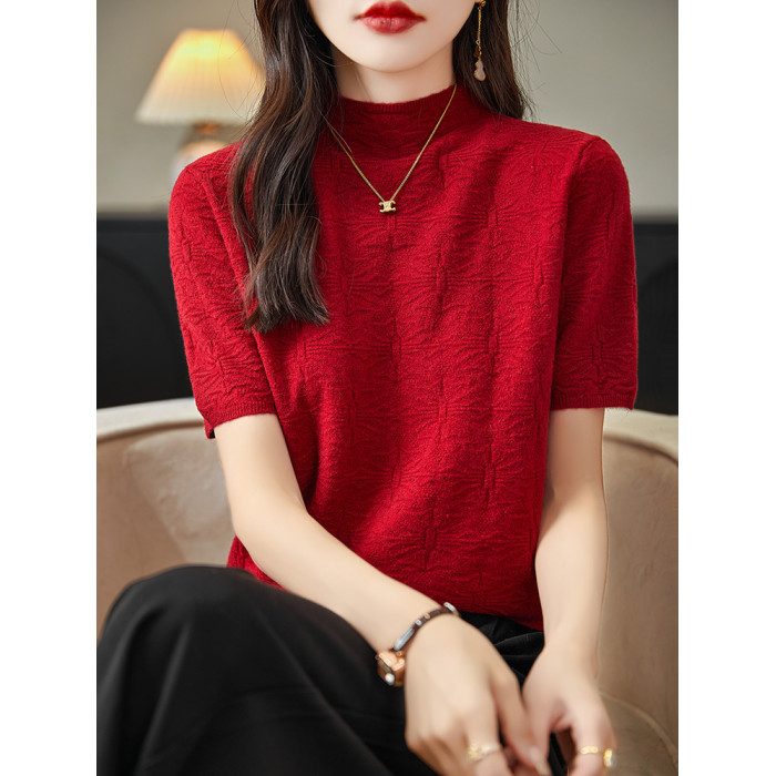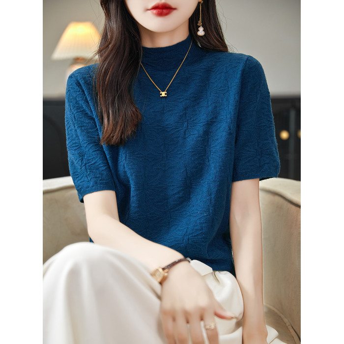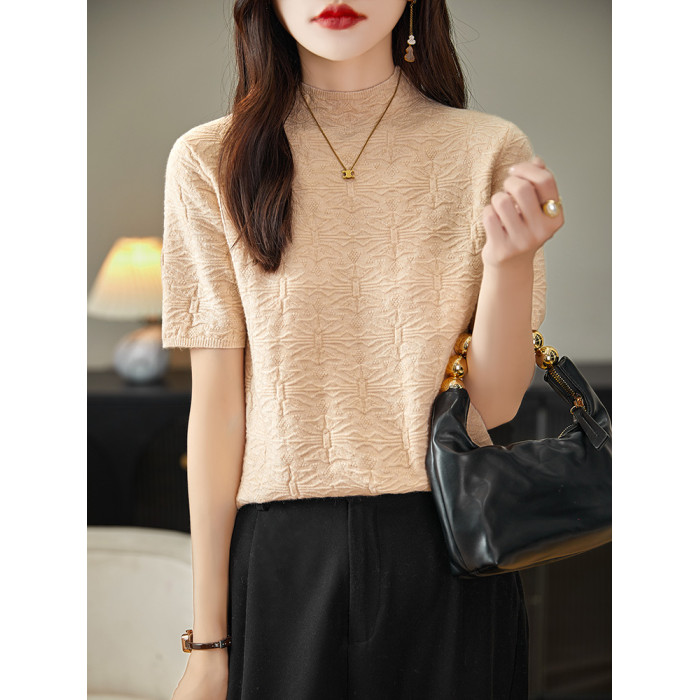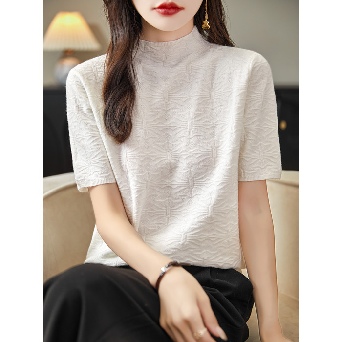 洋氣蝴蝶紋半高領針織短袖女春秋毛衣半袖寬松顯瘦內搭中領打底衫