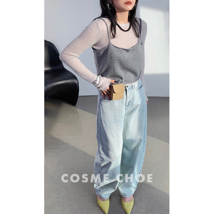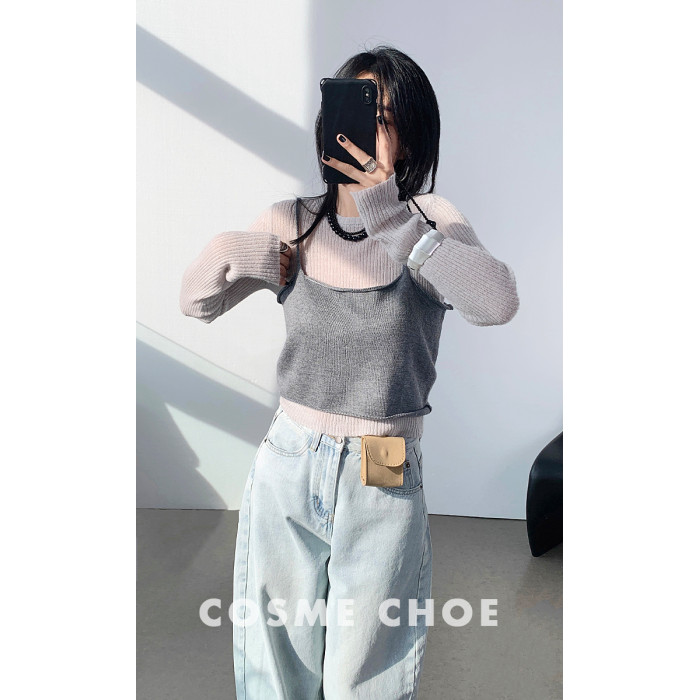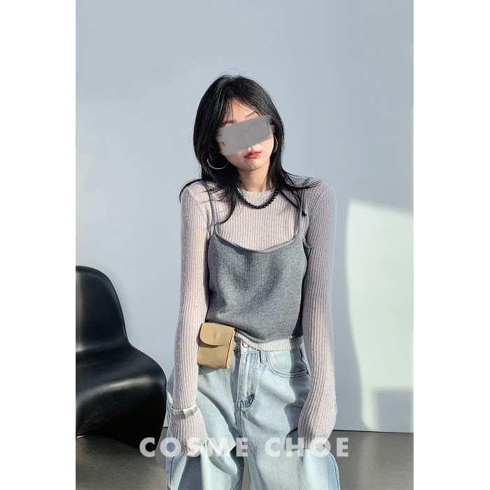韓系時尚羊毛坑條針織打底衫女25春薄款修身曡穿吊帶背心防曬上衣