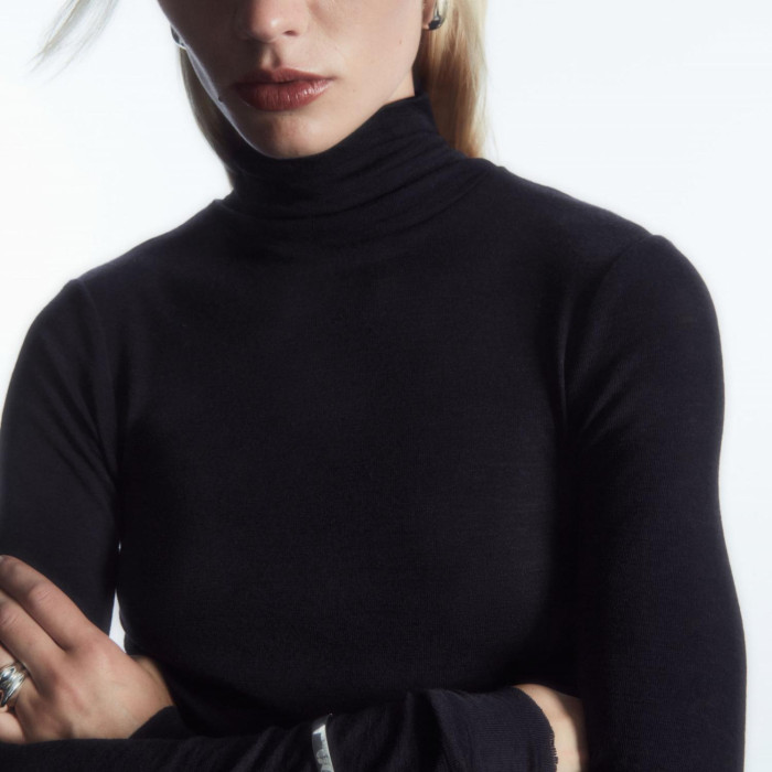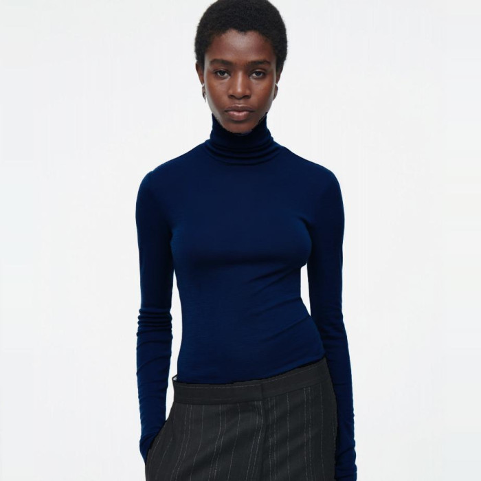 美利奴羊毛高級高領針織打底衫女秋冬別致毛衣內搭堆堆領藍色