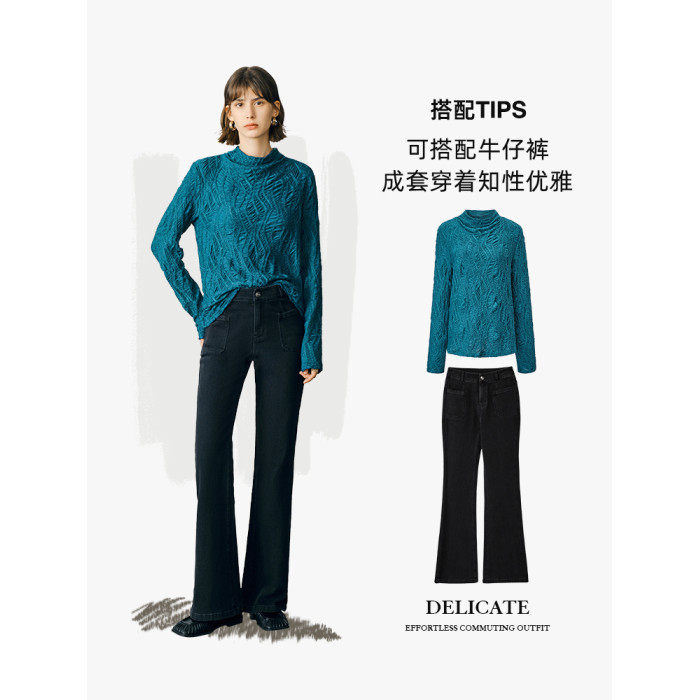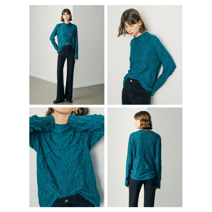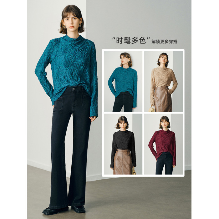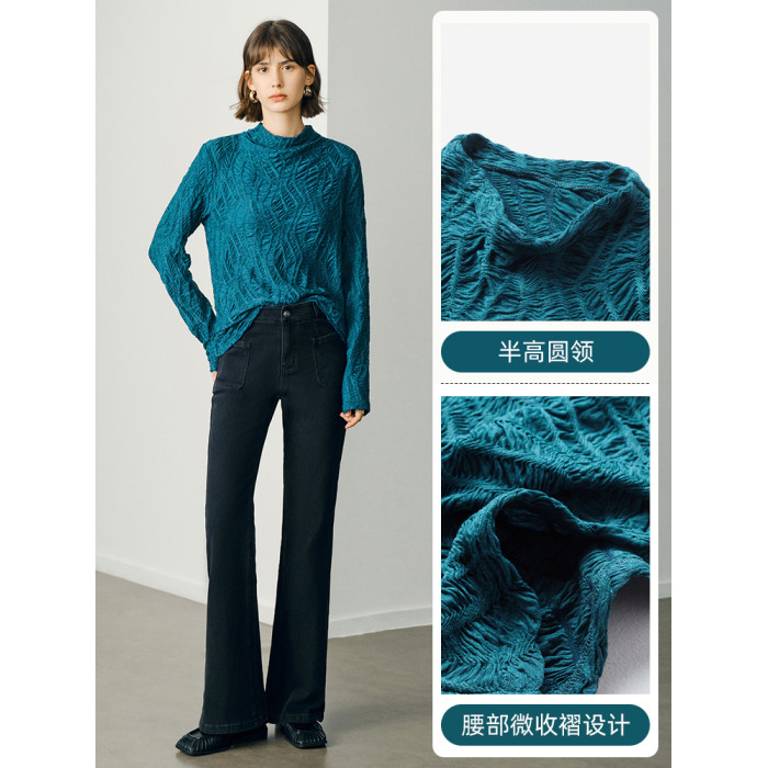 顔域藍色長袖打底衫女士2025新款秋季簡約通勤半高領長袖寬松上衣