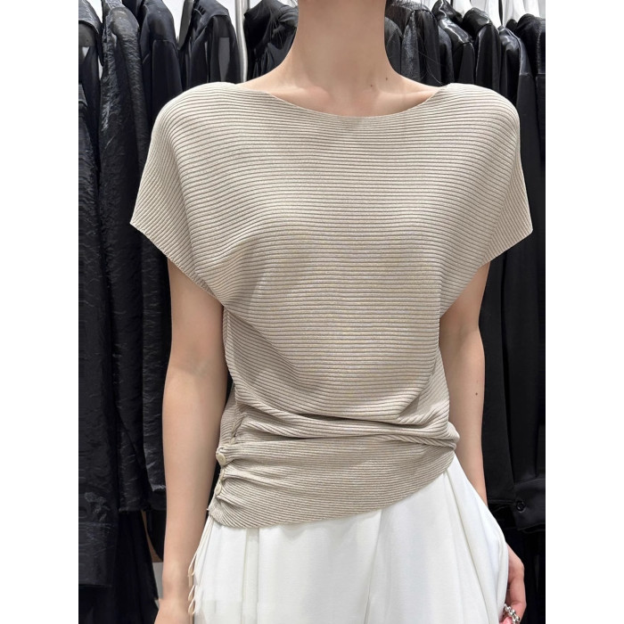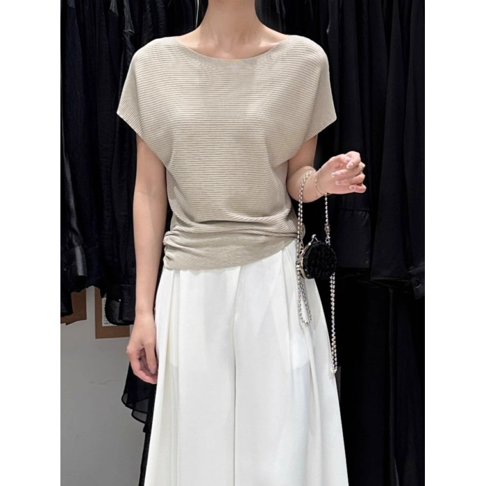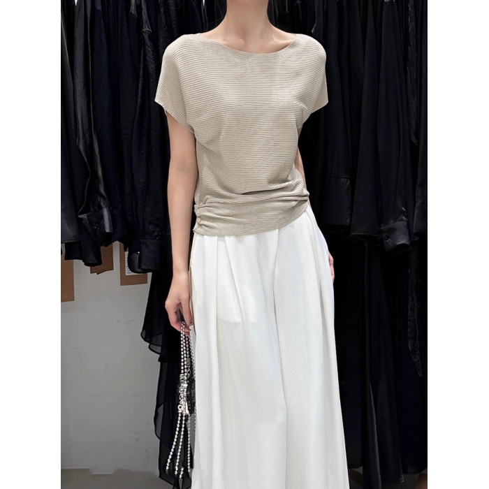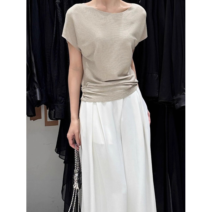冰絲薄款短袖針織衫女夏季2025新款韓系設計感褶皺收腰打底衫上衣