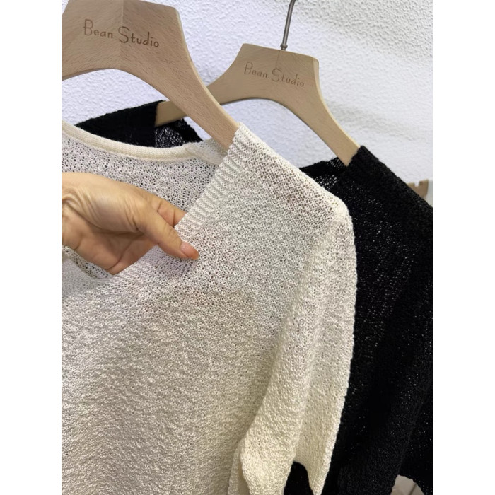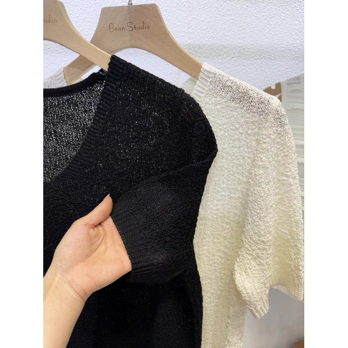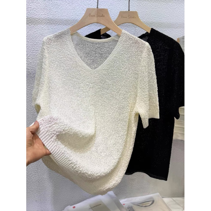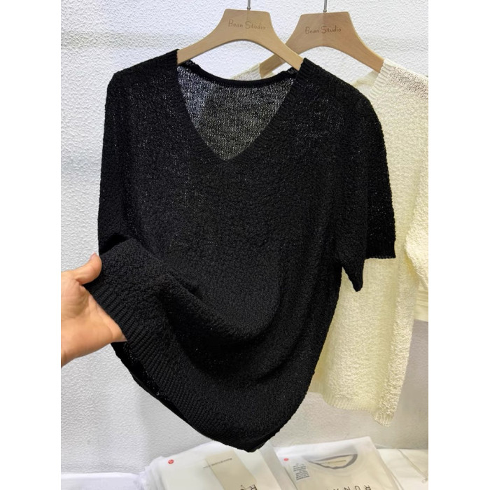 夏裝薄款內搭V領純色鏤空冰絲針織衫短袖女韓版寬松短款打底衫薄