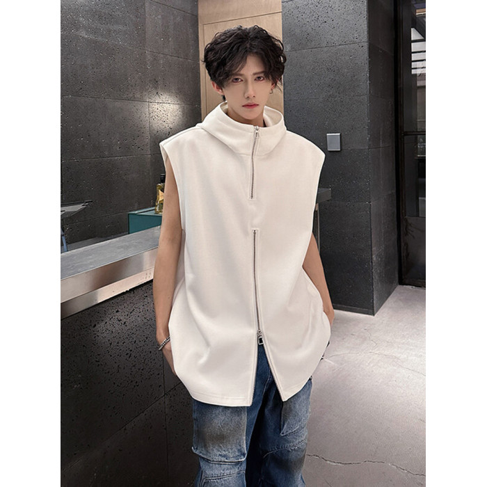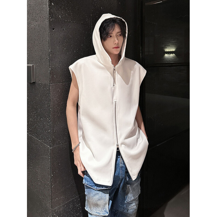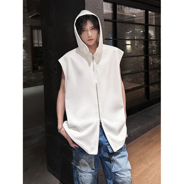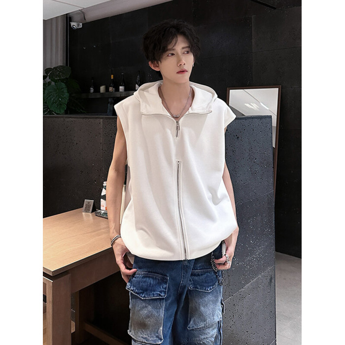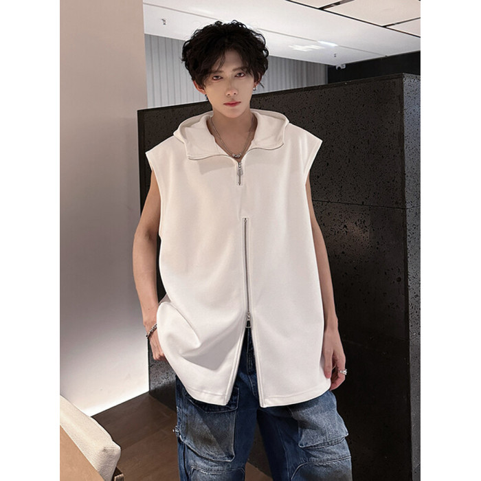 半拉鍊背心男款夏季潮牌美式高街vibe設計感寬松連帽坎肩無袖t恤