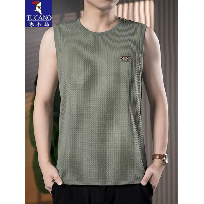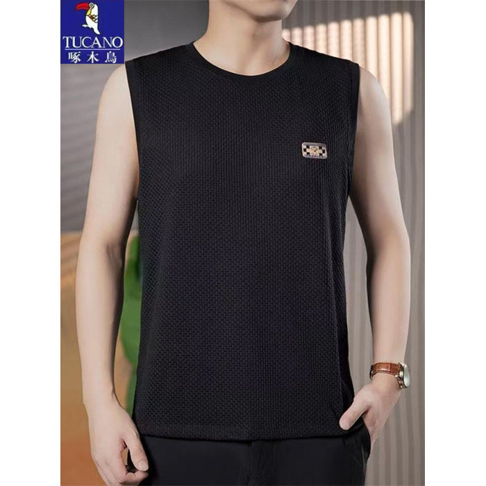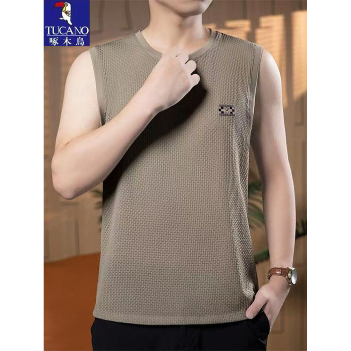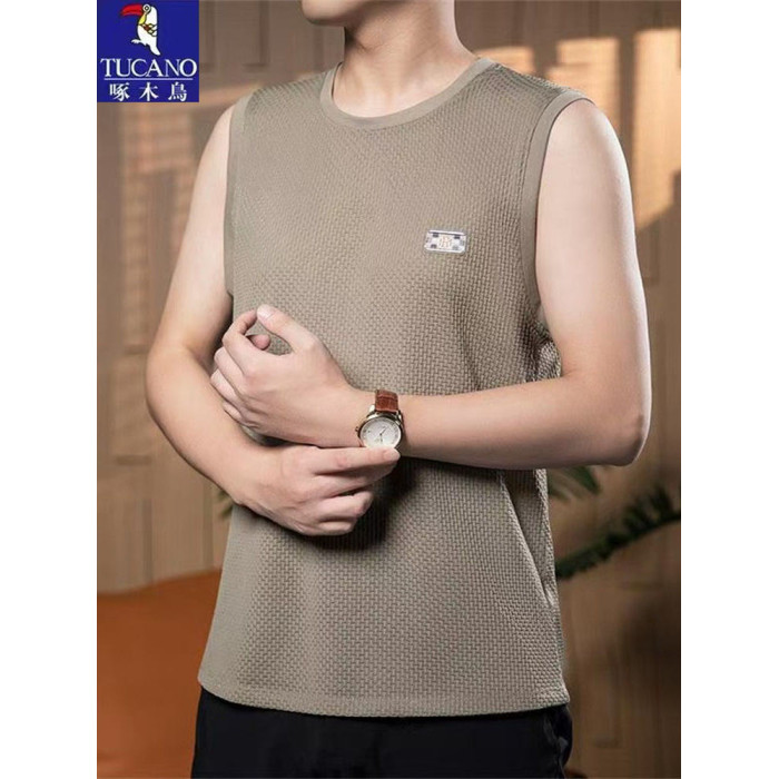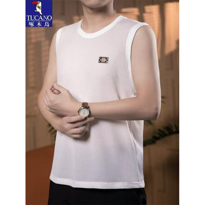 啄木鳥男士夏季新款背心冰絲休閒百搭運動健身坎肩無袖圓領上衣