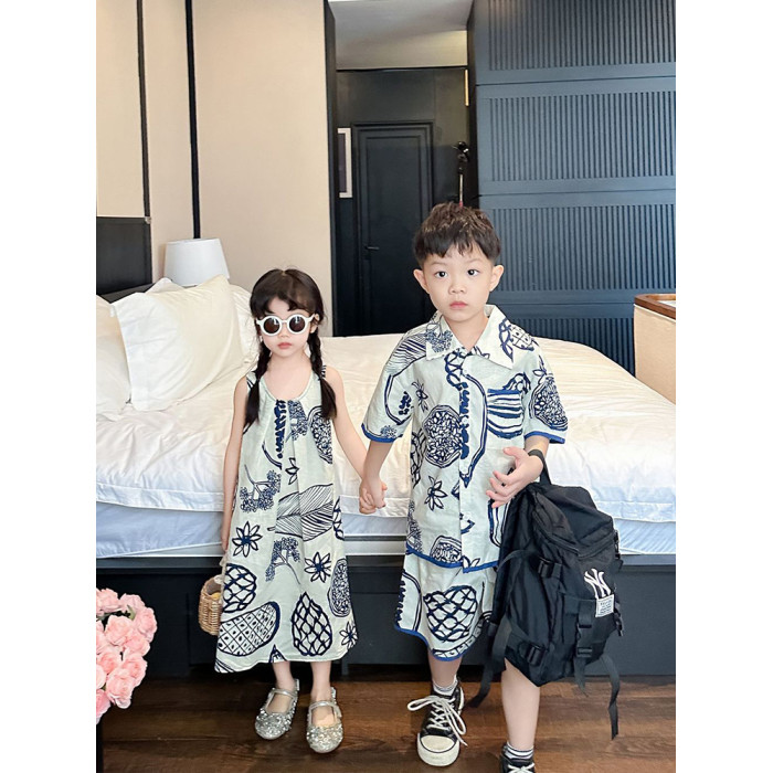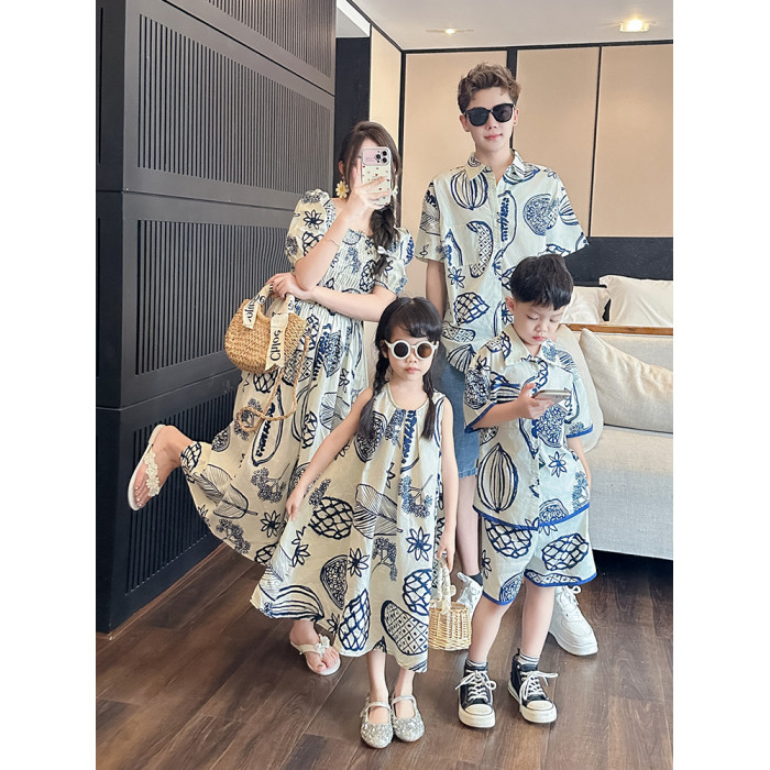 炸街親子裝一家三口夏裝2025新款母子裝母女裝沙灘短袖襯衫連衣裙