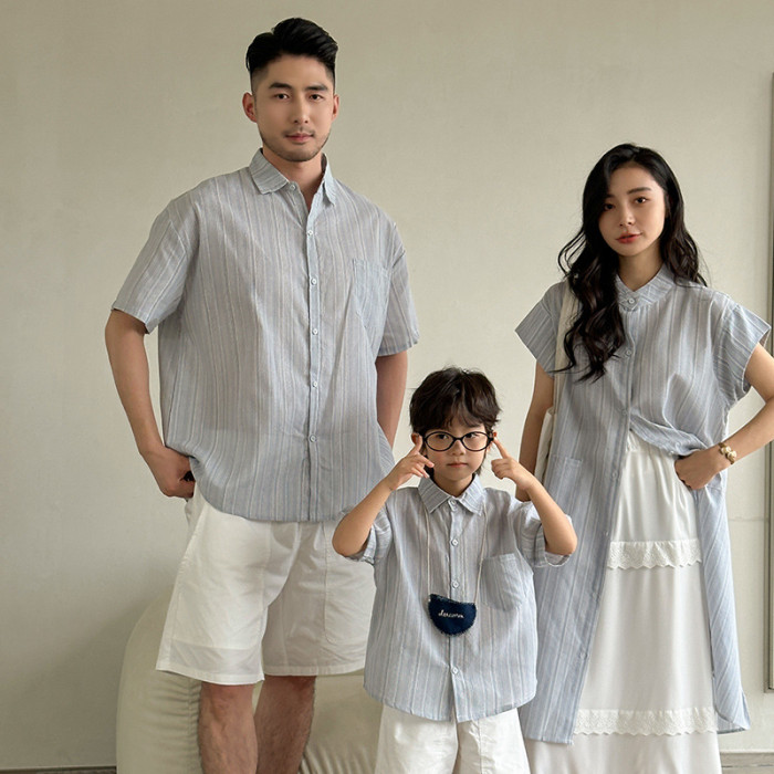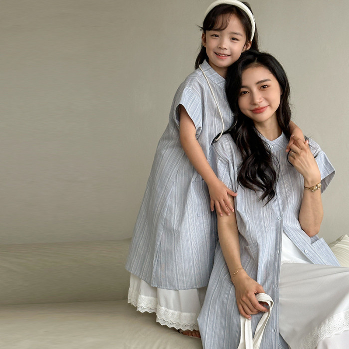 親子裝2025一家三四口夏季條紋短袖襯衣母女裝寬松度假休閒連衣裙