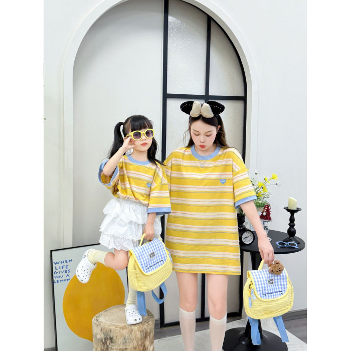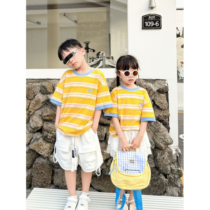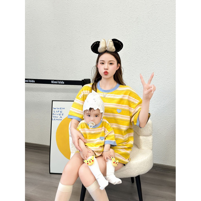 黃色條紋親子裝短袖t恤一家三口四口小月齡愛心爬服母子母女裝夏