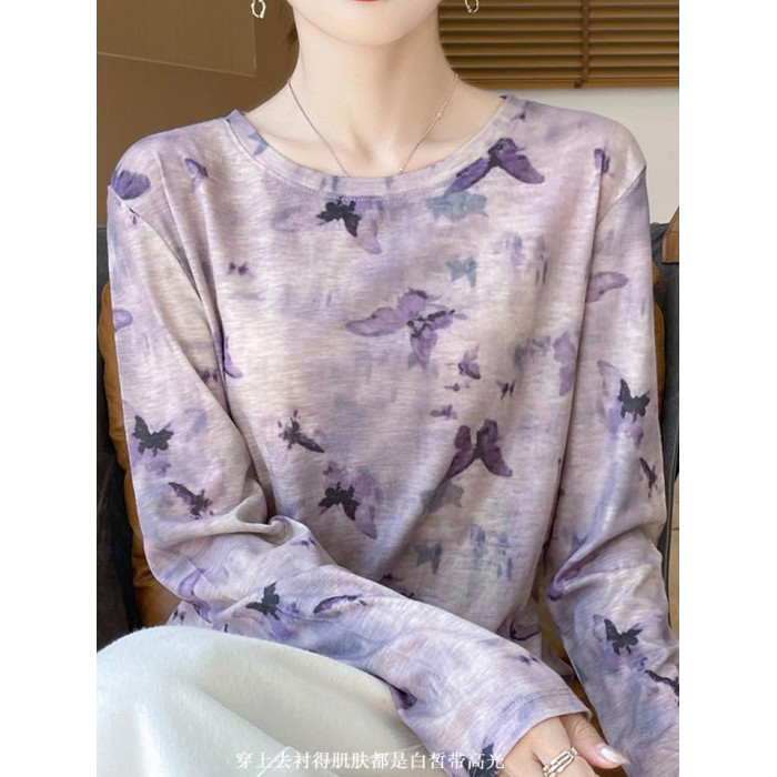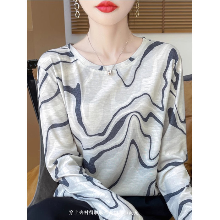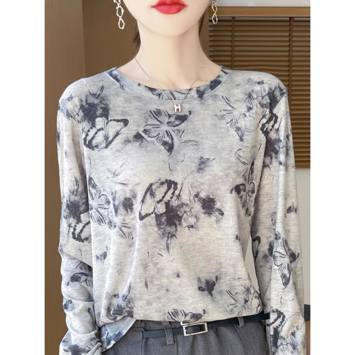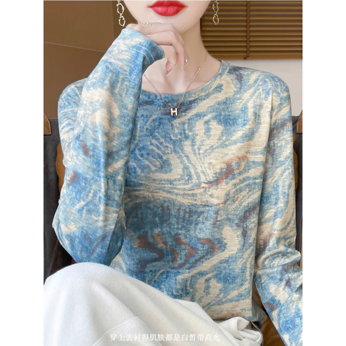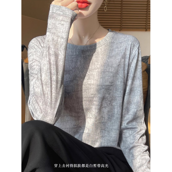 女套頭長袖薄款打底衫2025春秋冬天絲水墨畫內搭針織衫圓領上衣