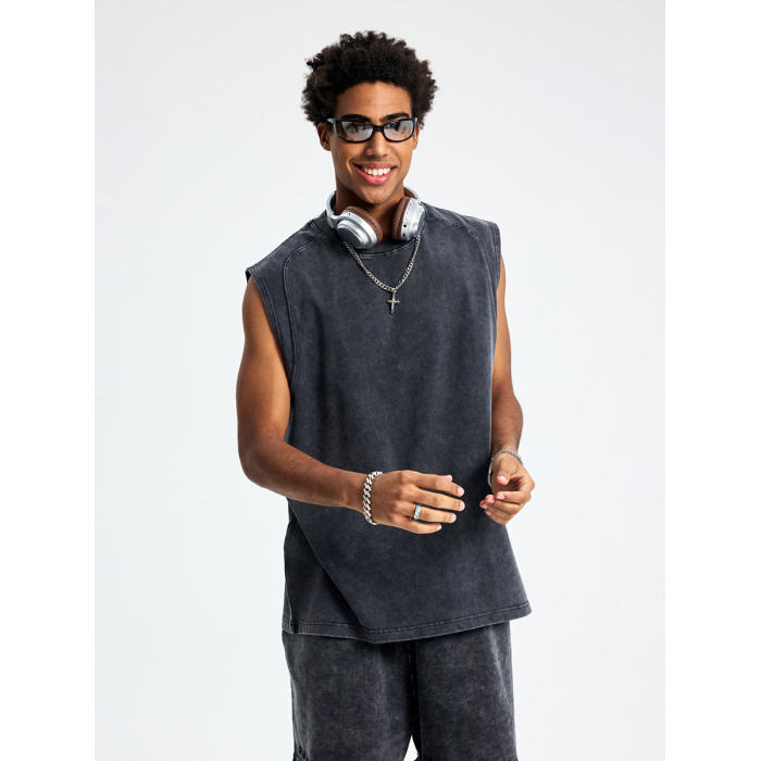 美式潮牌寬松寬肩重磅蠟染做舊運動健身圓領無袖T恤背心男坎肩夏