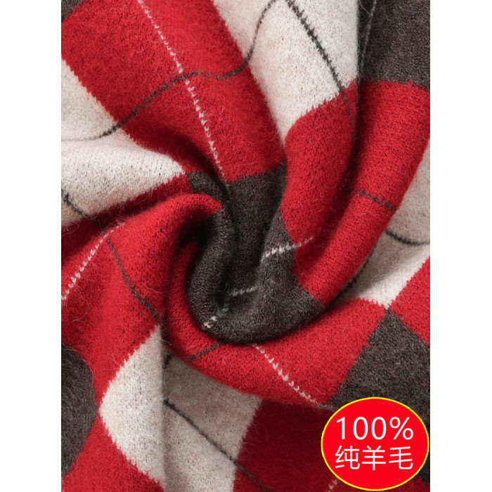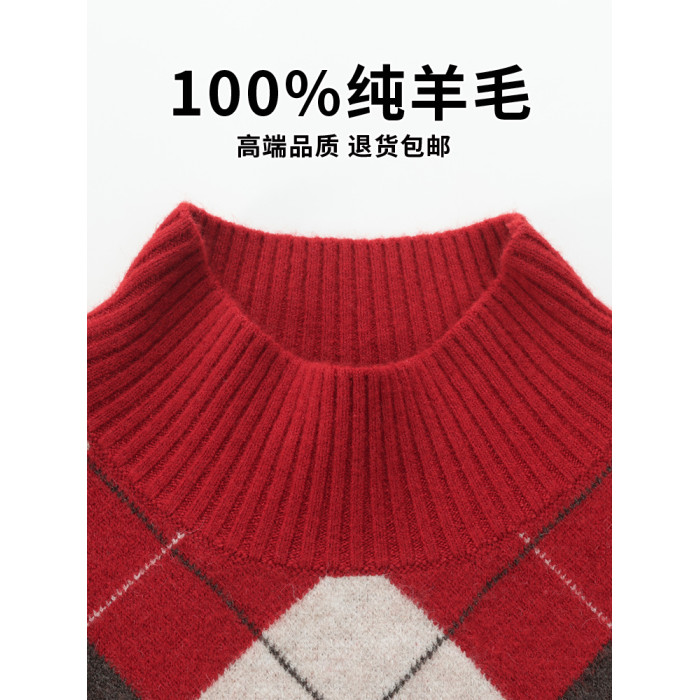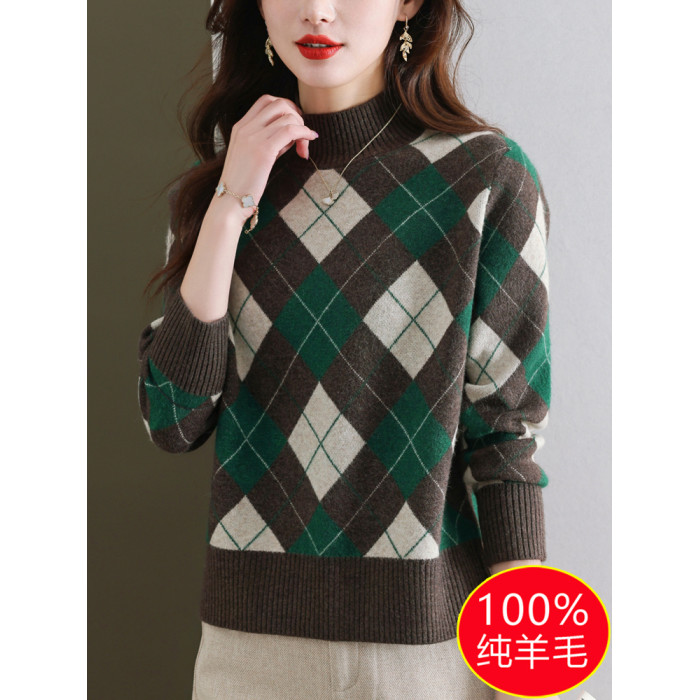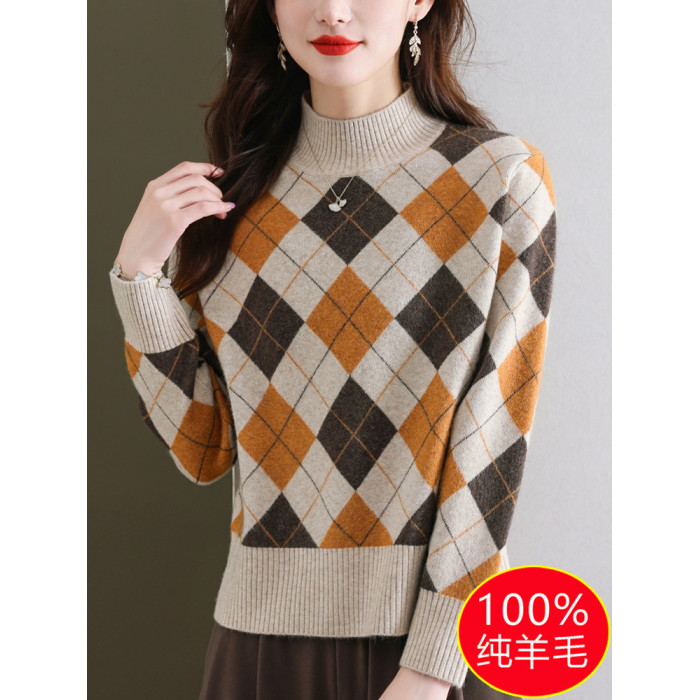 半高領女士毛衣100純羊毛衫秋冬打底衫菱形格子上衣內搭針織衫厚