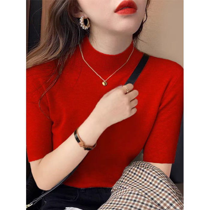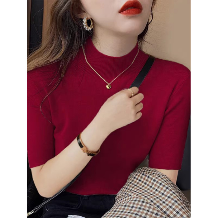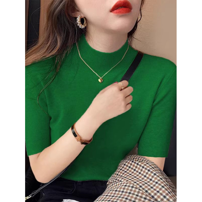半高領針織衫女2025春秋新款洋氣彈力修身上衣墨綠色五分袖打底衫