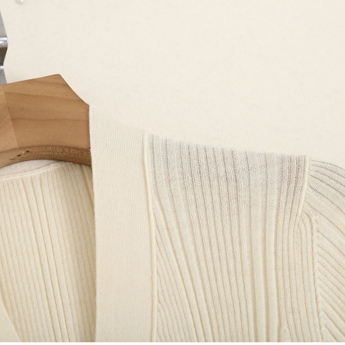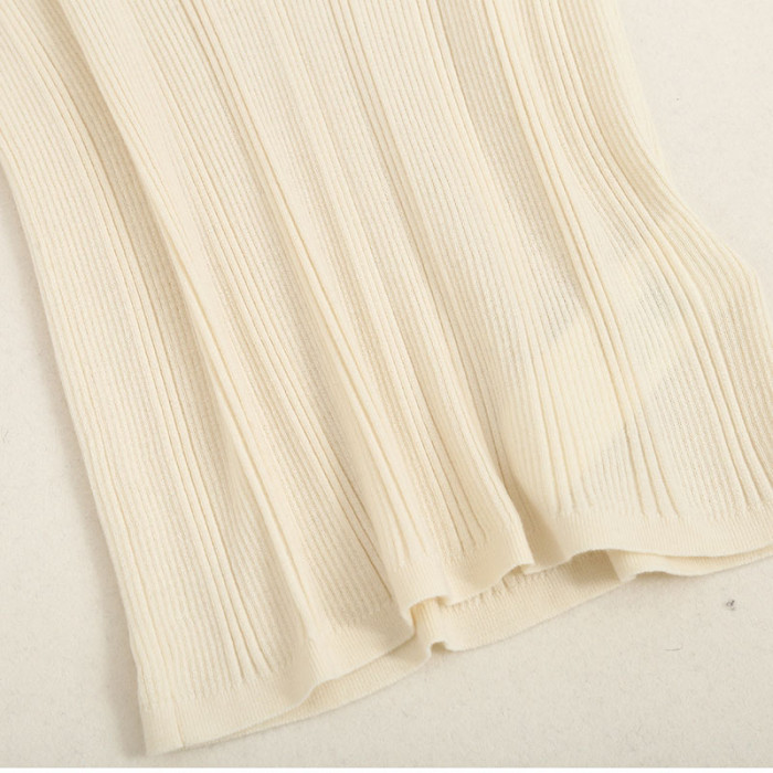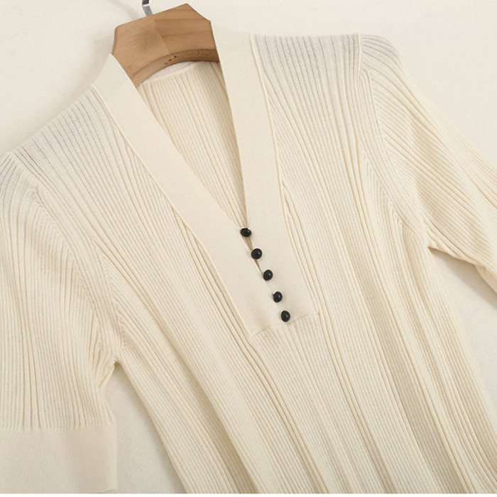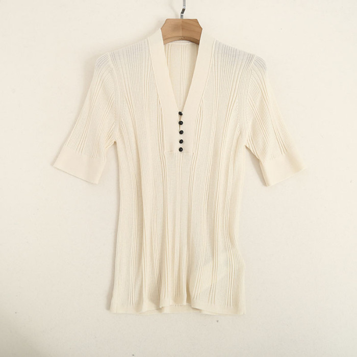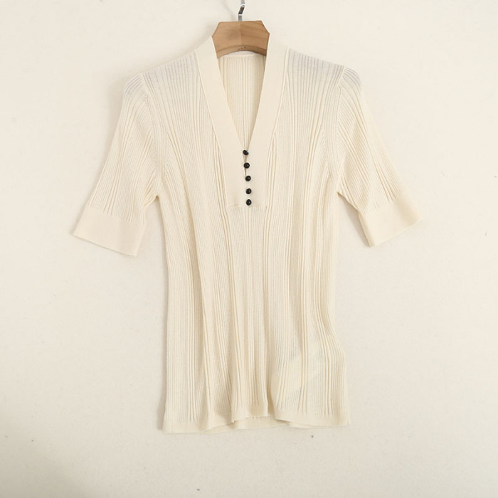 原單 55%桑蠶絲45%綿羊毛混紡彈力坑條針織打底衫V領純色短袖