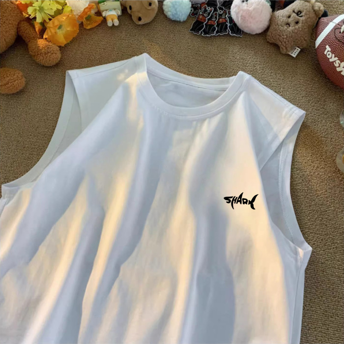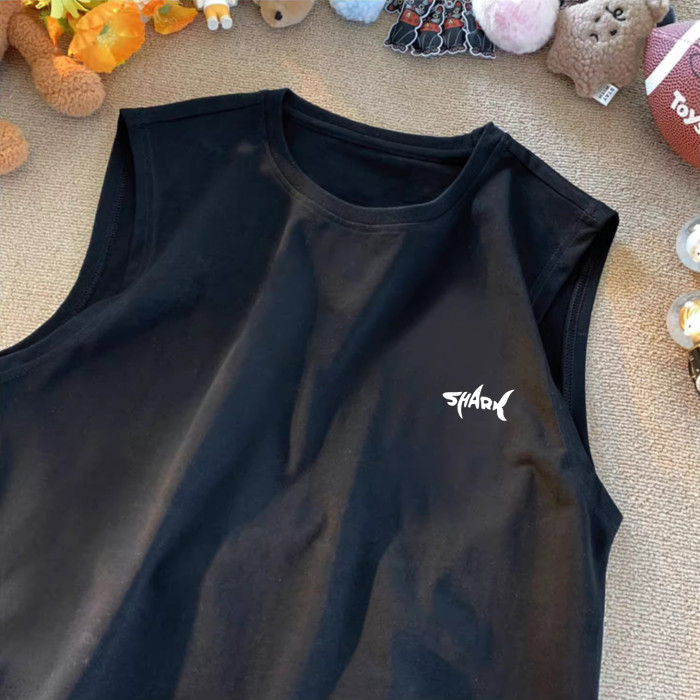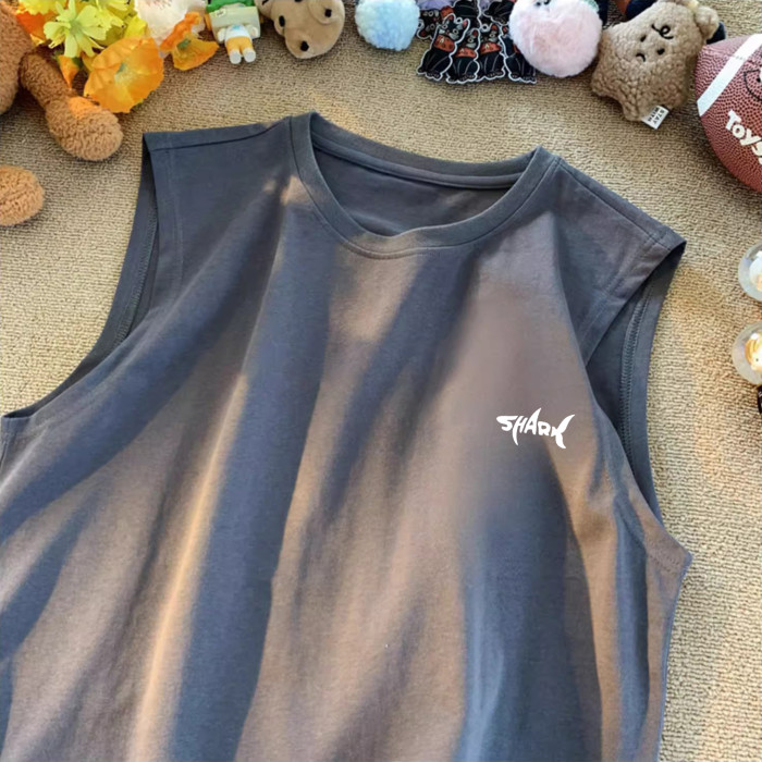 ins潮流美式字母鯊魚印花背心男夏款大碼簡約設計無袖t恤純棉220g