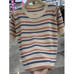 冰絲條紋針織衫女夏裝打底衫2025年新款寬松顯瘦鏤空透氣短袖上衣