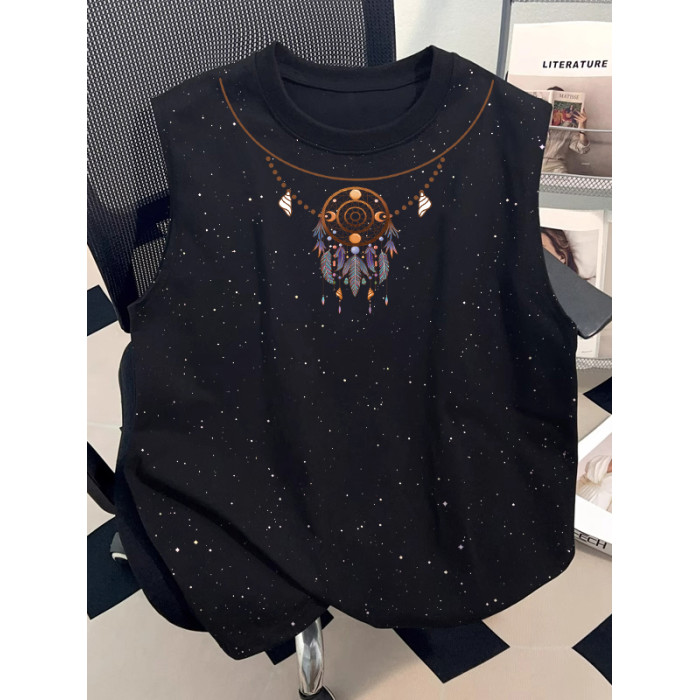 日系滿天星黑復古印花純棉背心男女2025新款潮流美式無袖寬松T恤