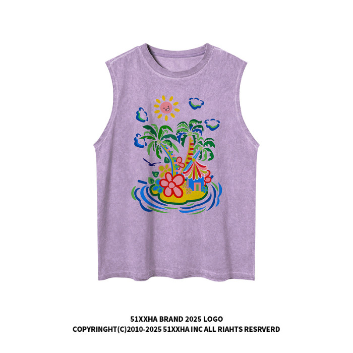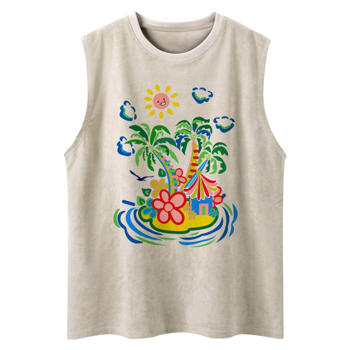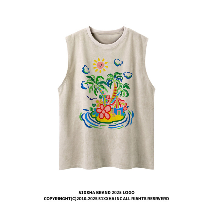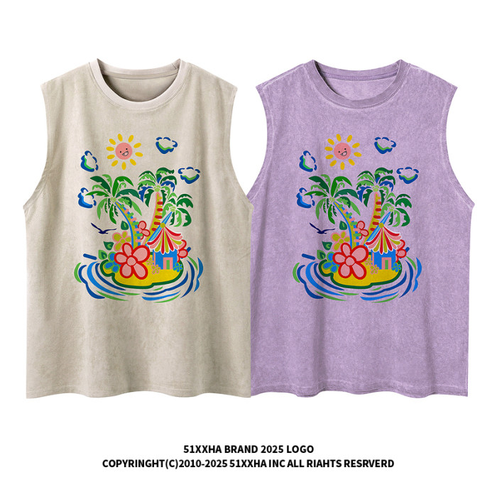 51嘻哈美式高街椰樹印花無袖T恤男夏季寬松oversize運動坎肩背心