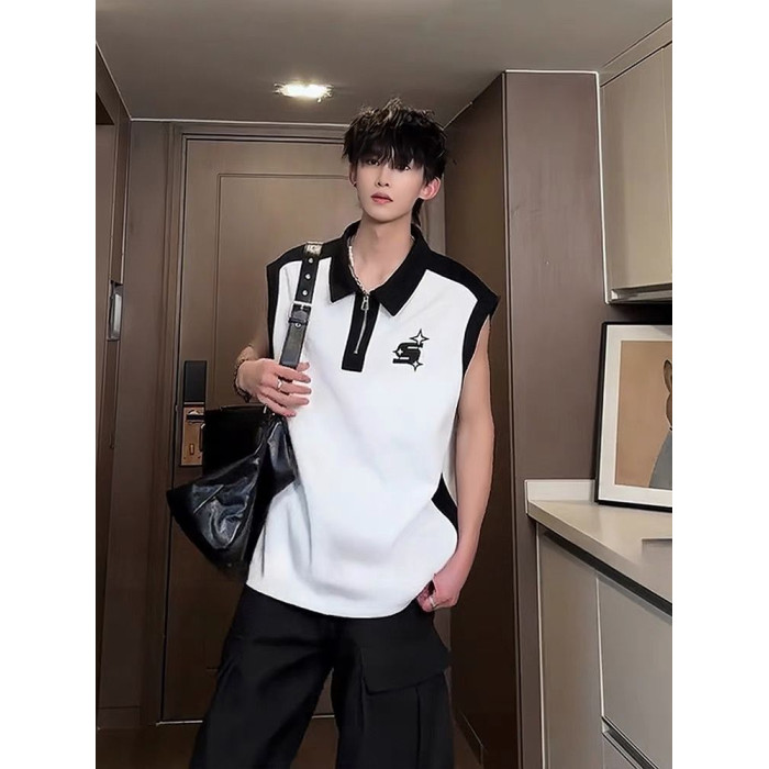半拉鍊背心男款夏季美式高街痞帥撞色運動坎肩高級感翻領無袖t恤