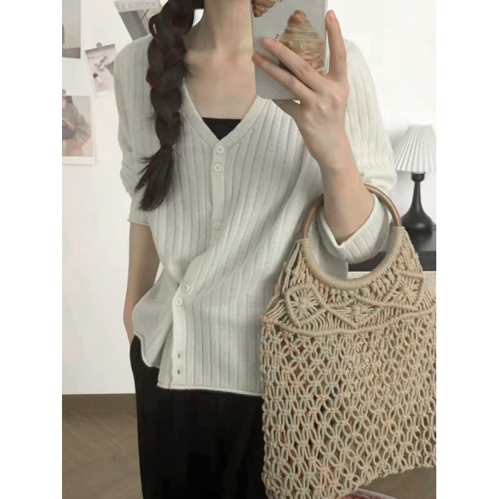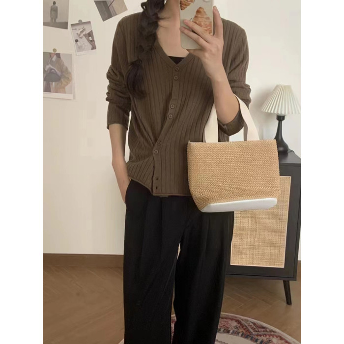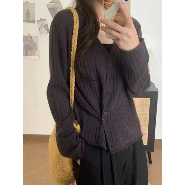 VK100%全羊毛V領針織開衫女修身打底衫秋季長袖坑條顯瘦上衣M9882