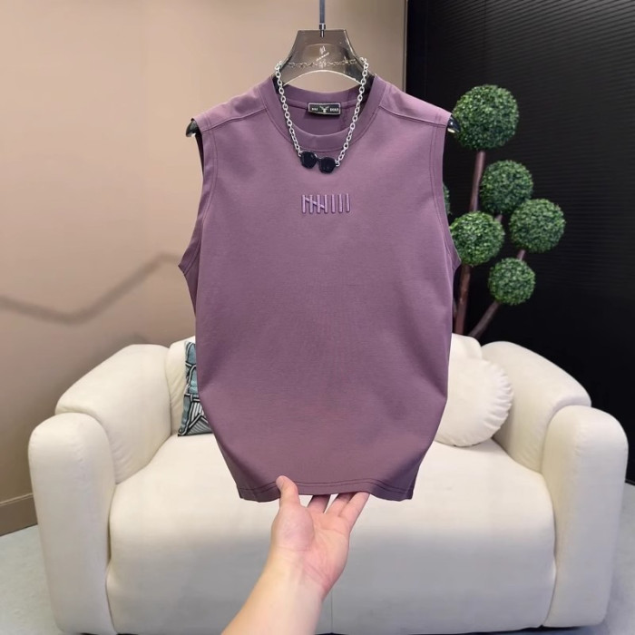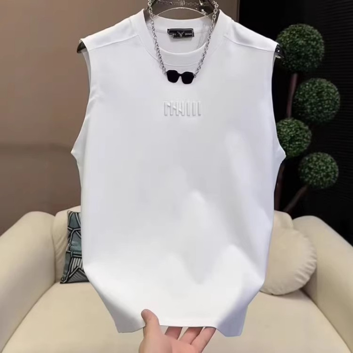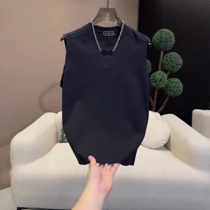 夏季新款男士潮流時尚百搭休閒圓領坎肩簡約刺綉無袖背心T恤上衣