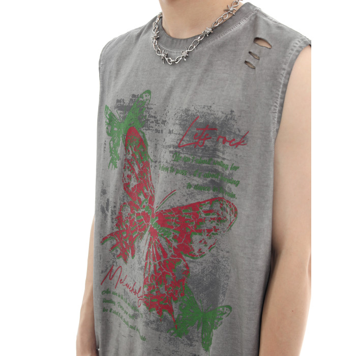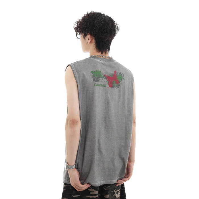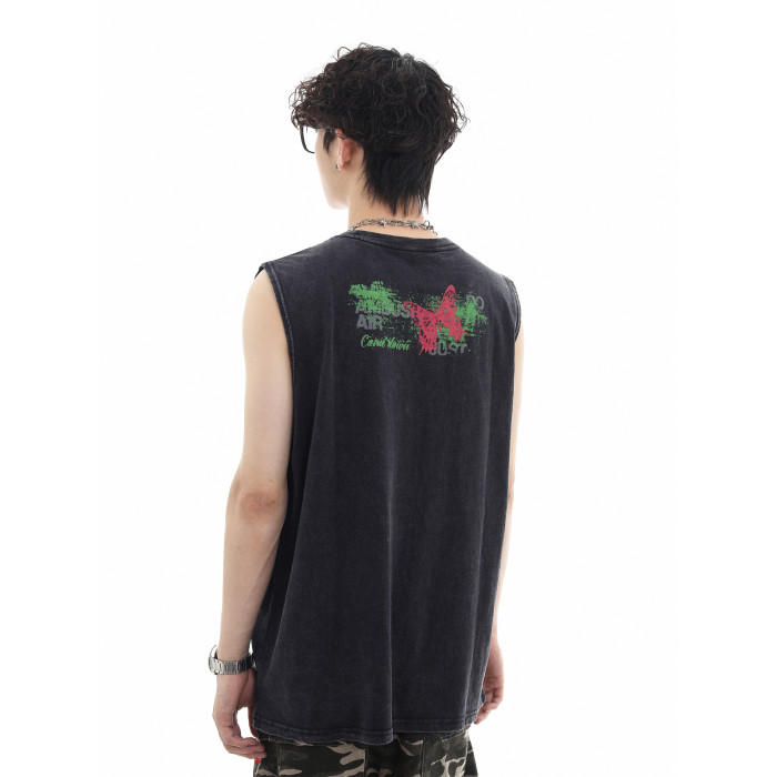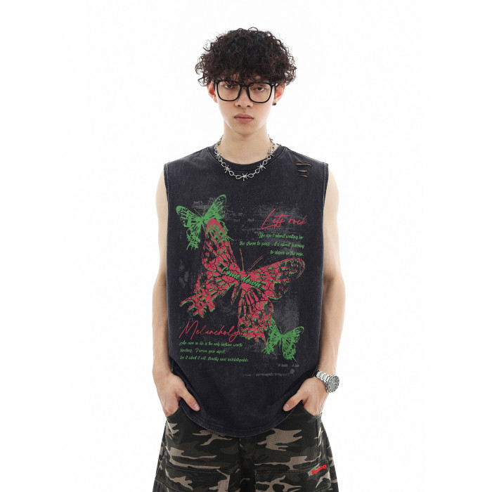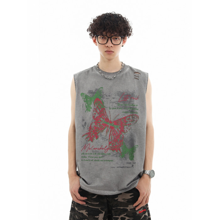 潮街區 無袖T恤男潮牌洗水做舊復古嘻哈印花破洞坎肩背心男生運動